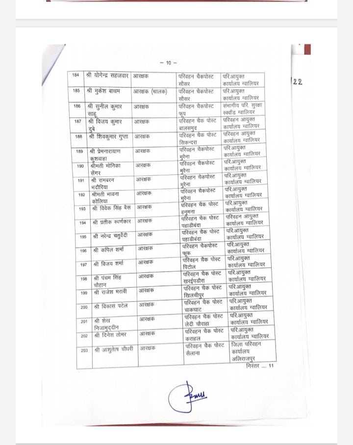 भोपाल, डेस्क रिपोर्ट। मध्यप्रदेश में तबादलों (MP Transfer) का दौर जारी है। आए दिन अधिकारी कर्मचारियों (officers) को नवीन पदस्थापना (New Posting) देकर इधर से उधर किया जाता है। इसी बीच परिवहन विभाग में बड़ी संख्या में अधिकारी कर्मचारियों को नवीन पदस्थापना सौंपी गई है।  जिसकी लिस्ट उपलब्ध कराई जा रही है। देखे लिस्ट