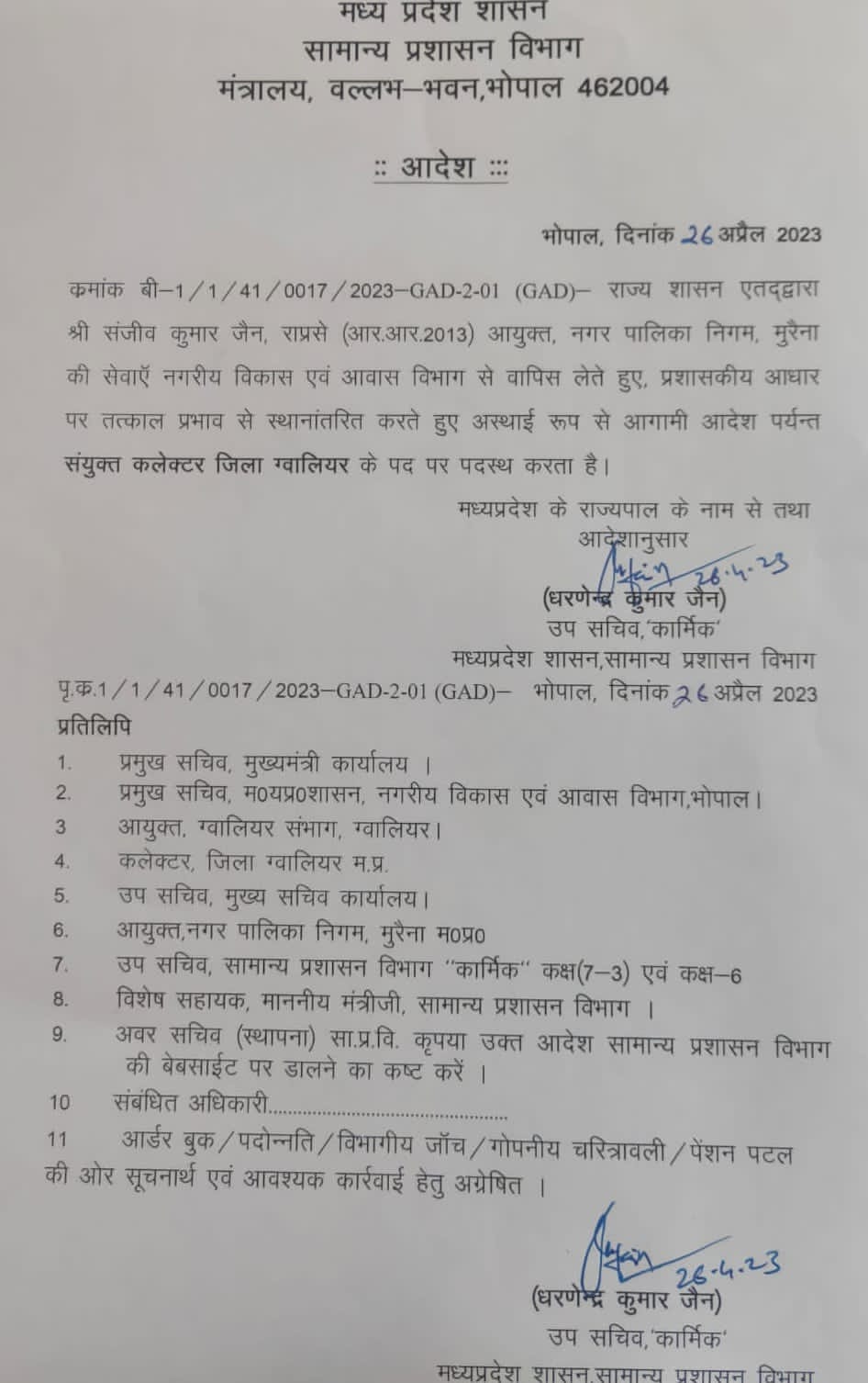 GAD द्वारा जारी किये गए तबादला आदेश में मुरैना नगर पालिका निगम के आयुक्त संजीव कुमार जैन को वहां से हटा दिया गया है , शासन ने श्री जैन की सेवाएं नगरीय विकास एवं आवास विभाग से वापस लेते हुए उन्हें ग्वालियर जिले में संयुक्त कलेक्टर के रूप में पदस्थ किया है।