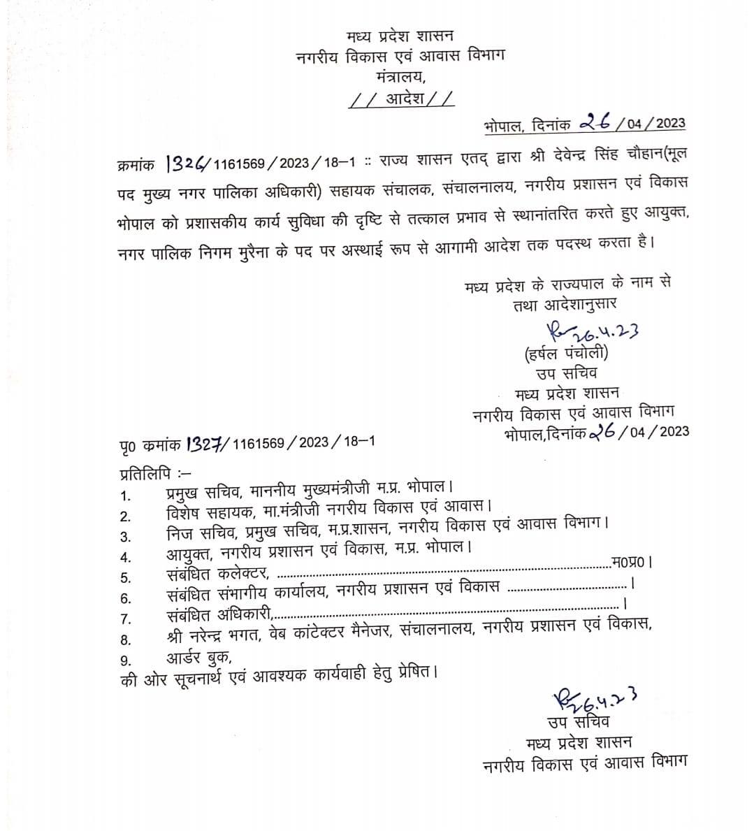 उधर एक अन्य आदेश में शासन ने संचालनालय, नगरीय विकास एवं आवास भोपाल में पदस्थ सहायक संचालक (मूल पद मुख्य नगर पालिका अधिकारी) देवेन्द्र सिंह चौहान को प्रशासकीय कार्य सुविधा की द्रष्टि से मुरैना नगर पालिका निगम आयुक्त के पद पर पदस्थ किया है।