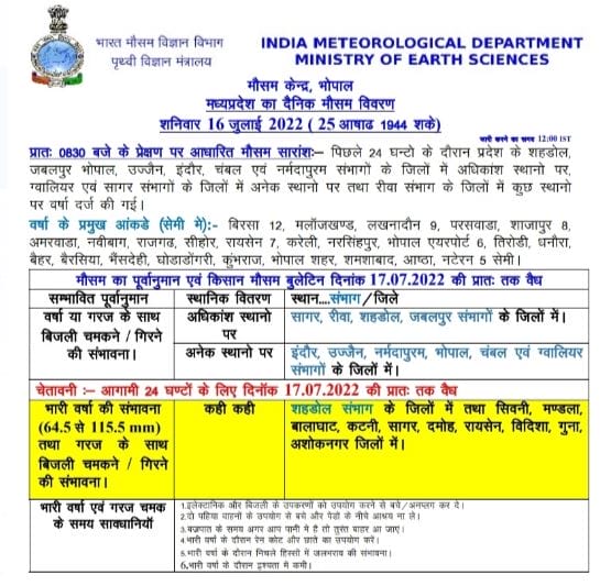 भोपाल, डेस्क रिपोर्ट। अलग अलग वेदर सिस्टम के एक्टिव होने से प्रदेशभऱ में झमाझम बारिश का दौर जारी है। वर्तमान में 3 वेदर सिस्टम एक्टिव है और अरब सागर से नमी मिल रही है। एमपी मौसम विभाग (MP Weather Department) के अनुसार, आज शनिवार 16 जुलाई 2022 को 13 जिलों में भारी बारिश का अलर्ट जारी किया गया है। बिजली गिरने और चमकने की चेतावनी जारी करते हुए येलो अलर्ट जारी किया गया है। 48 घंटे बाद फिर मौसम के बदलने के आसार है।
