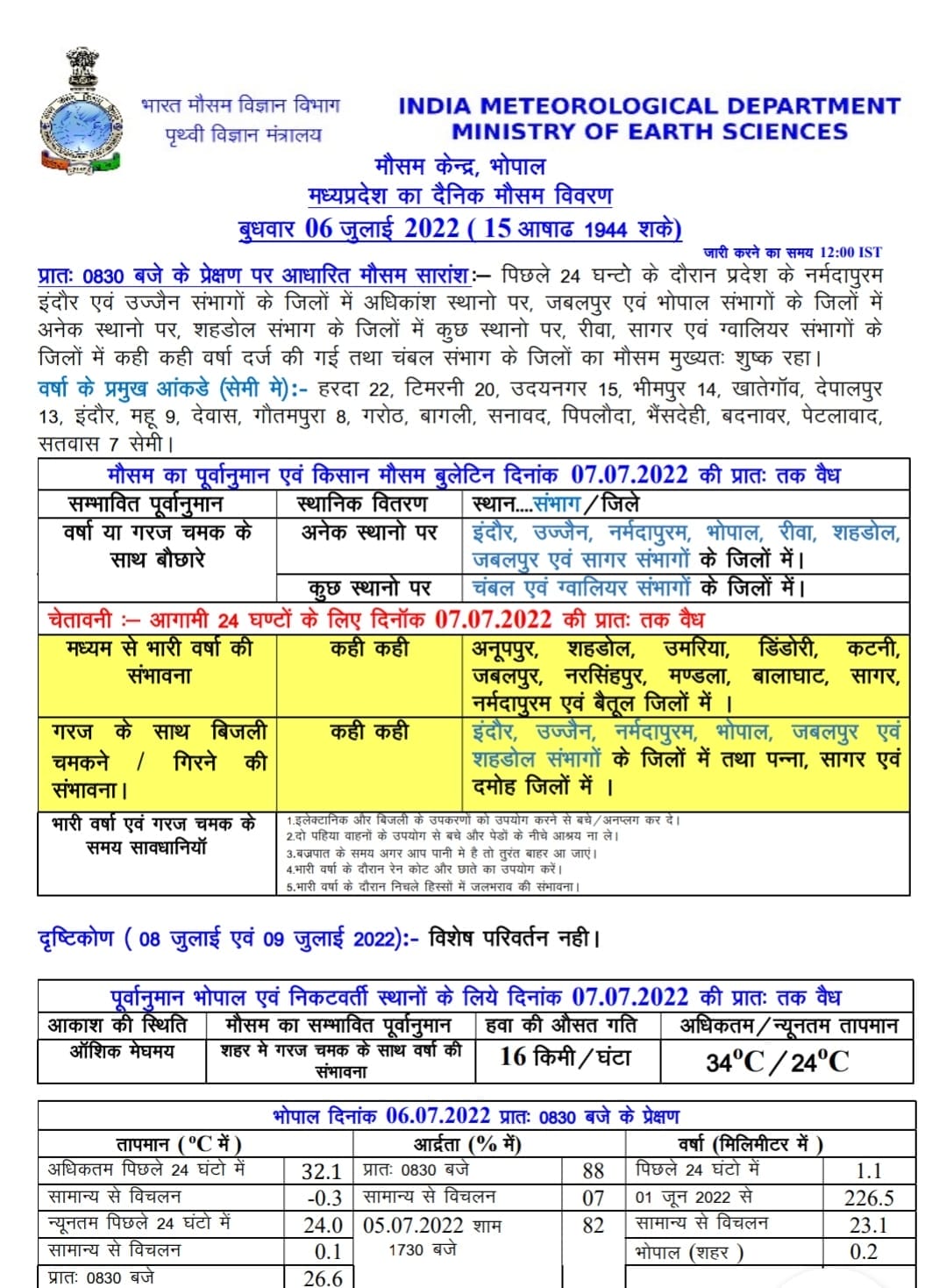 एमपी मौसम विभाग (MP Weather alert ) के अनुसार, आज बुधवार 6 जुलाई 2022 को अनूपपुर, शहडोल, उमरिया, डिंडौरी, कटनी, जबलपुर, नरसिंहपुर, मंडला, बालाघाट,सागर, नर्मदापुरम, बैतूल जिलों येलो अलर्ट जारी किया गया है। वही भोपाल, नर्मदापुरम, इंदौर, उज्जैन, जबलपुर और शहडोल संभाग के साथ पन्ना, सागर, और दमोह में गरज चमक के साथ बिजली गिरने और चमकने की चेतावनी जारी की गई है।