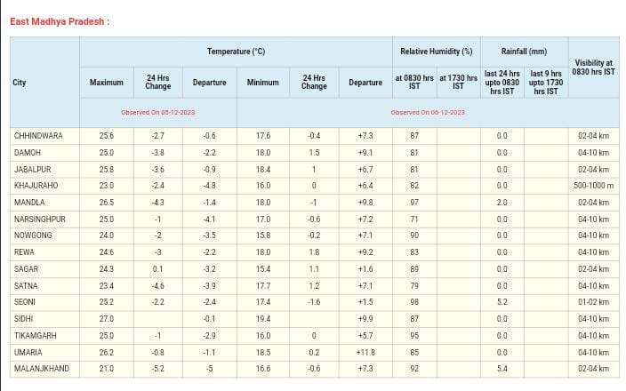 - भोपाल में 20.6 डिग्री सेल्सियस, ग्वालियर में 25 इंदौर में 20 रायसेन में 22.4 जबलपुर में 25.8 खजुराहो में 23 डिग्री सेल्सियस अधिकतम तापमान दर्ज हुआ ।