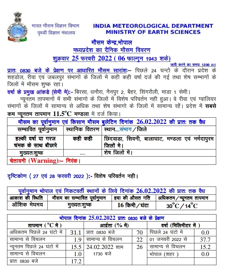 मौसम विभाग (MP Weather Report) के मुताबिक, पिछले 24 घंटों में शहडोल, रीवा और जबलपुर संभागों के जिलों में कहीं कहीं बारिश दर्ज की गई ।सबसे न्यूनतम तापमान 11.5% मंडला में दर्ज किया गया। रीवा और ग्वालियर संभागों के जिलों में तापमान सामान्य से अधिक और शेष संभागों के जिलों में विशेष परिवर्तन नहीं हुआ। इसके अलावा पिछले 24 घंटे में सिवनी के 40 से ज्यादा गांवों में तेज बारिश के साथ जोरदार ओलावृष्टि हुई, जिसके एक बार फिर किसानों की चिंता बढ़ा दी है और फसलों को भारी नुकसान पहुंचा है।