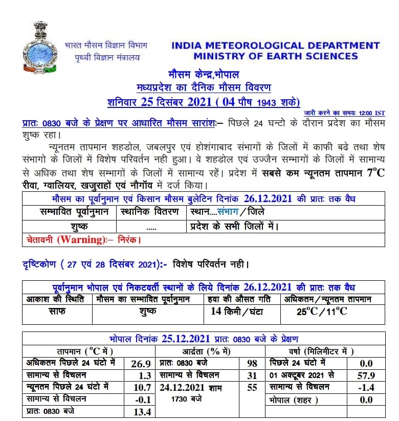 मौसम विभाग (MP Weather Forecast) के मुताबिक, आज शनिवार 25 दिसंबर 2021 को सभी जिलों के शुष्क रहने की संभावना जताई है, हालांकि 14 किमी/घंटा की रफ्तार से हवा चल सकती है। पिछले 24 घंटे में रीवा, ग्वालियर, खजुराहो और नौगांव में सबसे न्यूनतम पारा 7 डिग्री सेल्सियस दर्ज किया गया है। भोपाल में न्यूनतम तापमान 11 डिग्री के नीचे आ गया। पचमढ़ी में रात का पारा 8 डिग्री चढ़कर 12 पर पहुंच गया। होशंगाबाद और इंदौर में पारा 12 डिग्री सेल्सियस के ऊपर चले गए हैं।