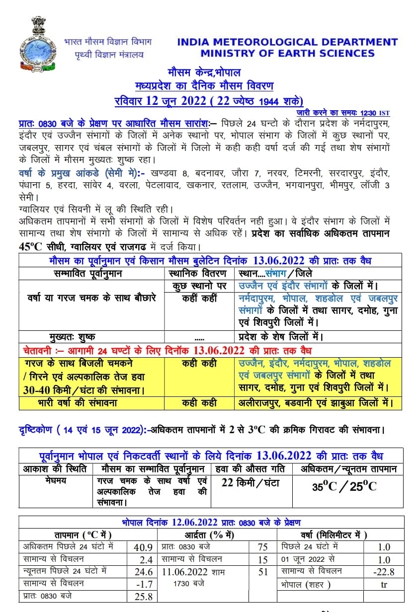 एमपी मौसम विभाग (MP Weather alert ) के अनुसार, पिछले 24 घंटे में सबसे अधिक तापमान सीधी,ग्वालियर और राजगढ़ में 45 डिग्री सेल्सियस तापमान दर्ज किया गया। वही नर्मदापुरम, इंदौर, उज्जैन, भोपाल, चंबल, जबलपुर और सागर संभागों में कहीं कहीं बारिश दर्ज की गई। आज रविवार 12 जून 2022 को 6 संभागों इंदौर, उज्जैन, नर्मदापुरम, भोपाल, शहडोल और जबलपुर संभाग के साथ 4 जिलों सागर, दमोह, गुना और शिवपुरी में गरज चमक के साथ बारिश की संभावना है।वही अलीराजपुर, बड़वानी और झाबुआ में भारी बारिश के चलते अलर्ट जारी किया गया है। वही गरज चमक के साथ बिजली चमकने गिरने और 40-50 किमी/घंटे की रफ्तार से हवा चलने को लेकर येलो अलर्ट जारी किया गया है।