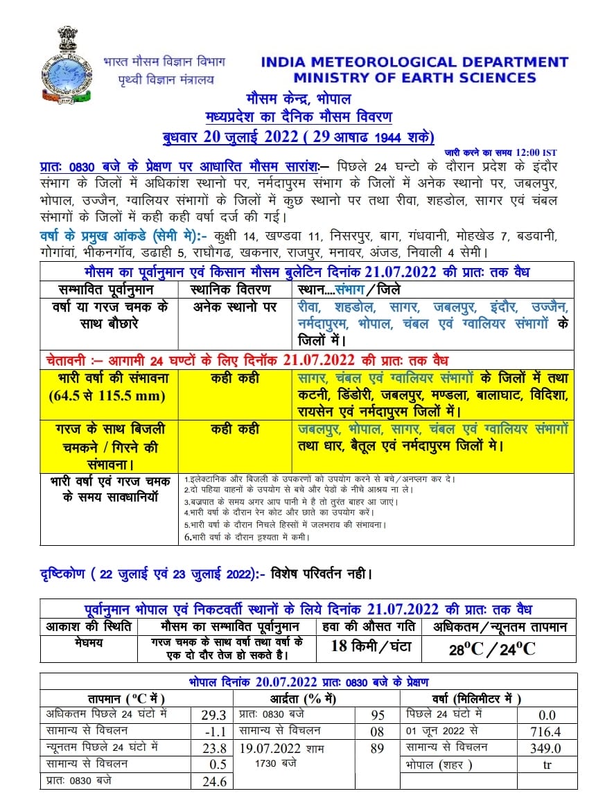 भोपाल, डेस्क रिपोर्ट। मध्य प्रदेश में एक साथ कई सिस्टम के एक्टिव होने के साथ साथ मानसून की सक्रियता भी बढने लगी है, जिसके चलते बारिश का दौर जारी है। नदी नाले उफान पर है और बांधों से पानी छोड़ने से नदियों का जलस्तर बढ़ने लगा है, ऐसे में कई गांवों पर बाढ़ का भी खतरा मंडराने लगा है। एमपी मौसम विभाग (MP Weather Department) के अनुसार, आज बुधवार 20 जुलाई 2022 को 22 जिलों में भारी से अति भारी बारिश का अलर्ट जारी किया गया है। वही 5 संभागों और 3 जिलों में बिजली गिरने और चमकने की चेतावनी जारी करते हुए येलो अलर्ट जारी किया गया है। अगले दो दिन तक ऐसा ही मौसम बना रहेगा।