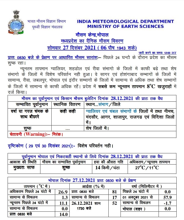 भोपाल, डेस्क रिपोर्ट। नए वेदर सिस्टम के एक्टिव होने से मध्य प्रदेश का मौसम बदलने लगा है। एक तीव्र आवृति वाला पश्चिमी विक्षोभ उत्तर भारत में सक्रिय, दक्षिण-पश्चिमी राजस्थान पर एक प्रेरित चक्रवात, पश्चिमी मध्यप्रदेश से होकर विदर्भ तक एक द्रोणिका लाइन (ट्रफ) और अतिरिक्त दक्षिण-पश्चिमी बिहार पर हवा के ऊपरी भाग में एक चक्रवात बना हुआ है। 4 नए वेदर सिस्टम एक्टिव होने से एमपी मौसम विभाग (MP Weather Department) ने आज सोमवार 27 दिसंबर 2021 को 14 जिलों में कहीं कहीं बारिश की संभावना जताई है।वही 14 किमी/घंटा की रफ्तार से हवा चल सकती है।पिछले 24 घंटे में सबसे न्यूनतम तापमान 8 डिग्री सेल्सियस खजुराहो में दर्ज किया गया।