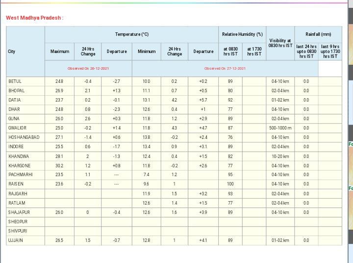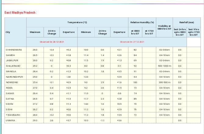 मौसम विभाग (MP Weather Forecast) के मुताबिक, वर्तमान में पश्चिमी विक्षोभ अफगानिस्तान और पाकिस्तान के ऊपर समुद्र तल से 3.1 किमी की ऊँचाई पर एक चक्रवातीय परिसंचरण के रूप में अवस्थित है, जिसके प्रभाव में प्रेरित चक्रवातीय परिसंचरण दक्षिण-पश्चिमी राजस्थान के ऊपर सक्रिय है। इस चक्रवातीय परिसंचरण से लेकर पश्चिमी मध्य प्रदेश और विदर्भ तक एक ट्रफ लाइन भी गुजर रही है। साथ ही दक्षिण-पश्चिमी बिहार के ऊपर भी चक्रवातीय परिसंचरण (Cyclonic circulation) अभी सक्रिय है। इनके कारण और 28-29 दिसंबर को मुख्यतः उत्तरी, मध्य और पूर्वी क्षेत्रों में वर्षा/ तड़ित झंझावात की संभावनाएं बनी हुई हैं।