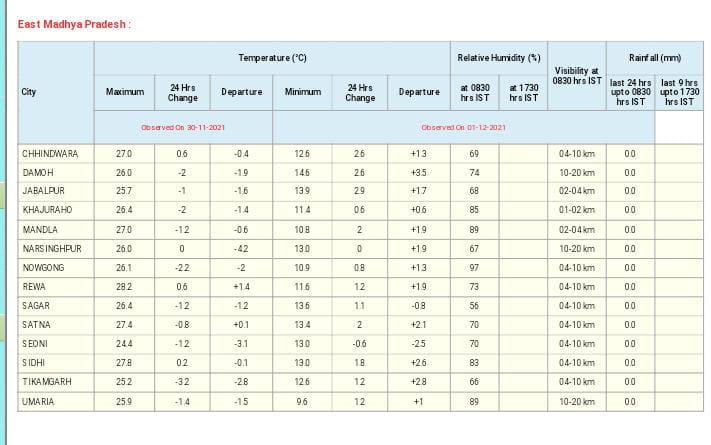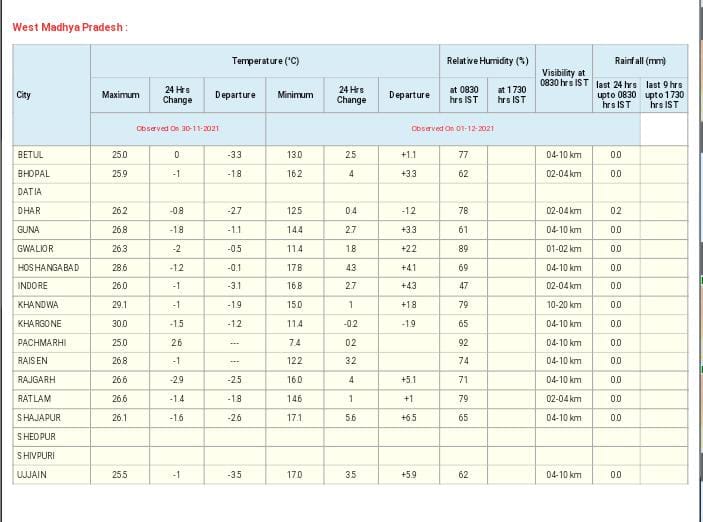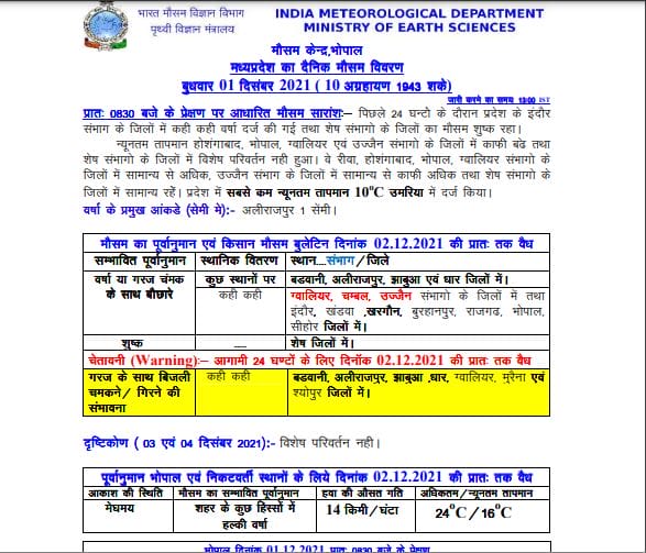 भारतीय मौसम विभाग (MP Weather Forecast) के अनुसार, 1 से 3 दिसंबर तक उत्तर भारत के राज्यों और केंद्र शासित प्रदेशों जैसे जम्मू, कश्मीर, लद्दाख, मुजफ्फराबाद में गरज-बिजली गिरने की संभावना हैं।1 और 2 दिसंबर को गुजरात में अति भारी बारिश के साथ 1 दिसंबर को उत्तरी कंकण, जम्मू-कश्मीर और लद्दाख में भी भारी बारिश (Heavy rain) की संभावना है।आंध्र प्रदेश तट और ओडिशा से टकराने वाले चक्रवाती तूफान के गुरुवार तक उत्तर-पश्चिम की ओर बढ़ने के आसार है, जिसके बाद 5-6 दिसंबर को उत्तर-पूर्वी राज्यों में भी बारिश हो सकती है। इसी के चलते गुजरात, मध्य महाराष्ट्र, कोंकण और गोवा के लिए ऑरेंज अलर्ट जारी किया है। इसके अलावा अंडमान और निकोबार द्वीप समूह भी ऑरेंज अलर्ट पर है। पश्चिमी विक्षोभ के चलते गुरुवार को हिमाचल प्रदेश और उत्तराखंड के कुछ हिस्सों में भारी बारिश और बर्फबारी हो सकती है।