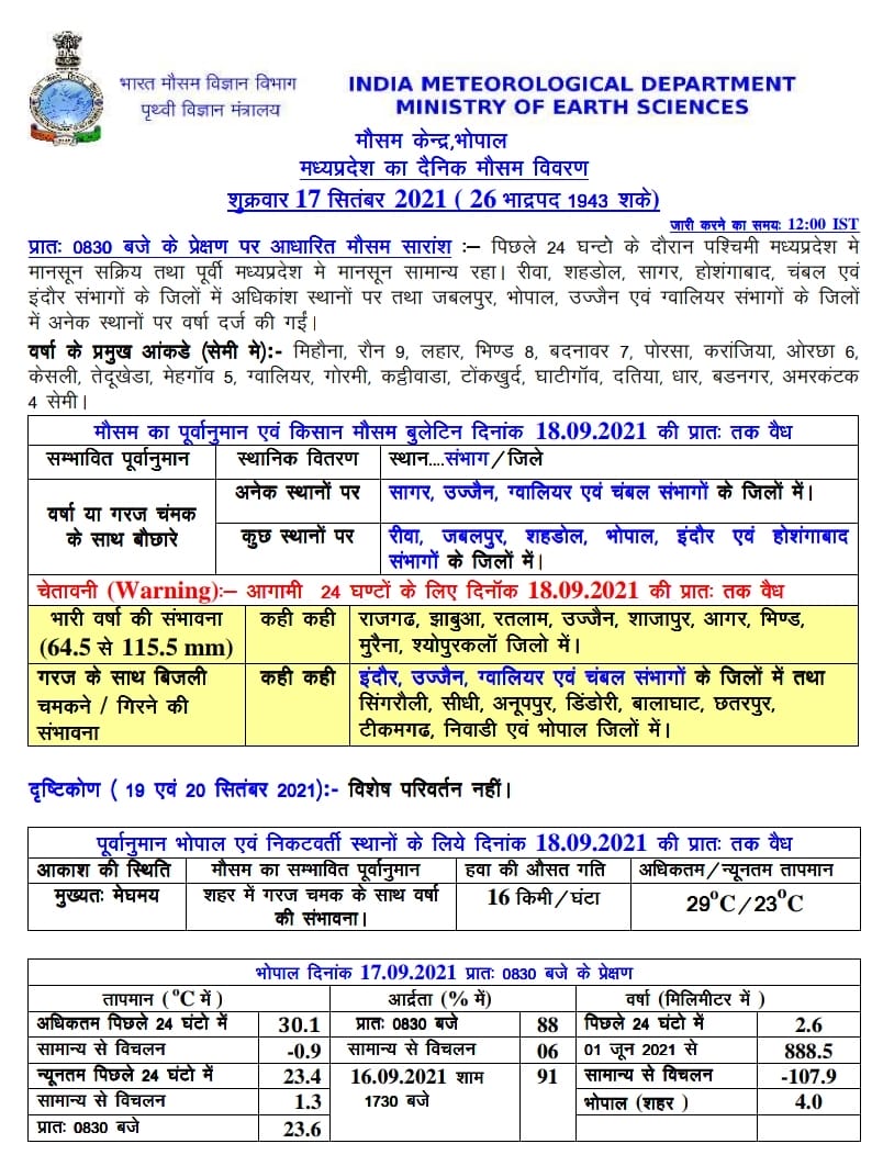 मौसम विभाग (MP Weather Cloud) ने आज शुक्रवार 17 सितंबर 2021 को सभी संभागों होशंगाबाद , भोपाल, उज्जैन सागर, रीवा, ग्वालियर इंदौर, चंबल, जबलपुर और शहडोल में कहीं-कहीं गरज-चमक के साथ बारिश की संभावना जताई है। वही राजगढ़, झाबुआ, रतलाम, उज्जैन, आगर, शाजापुर, भिंड, मुरैना और श्योपुरकलां जिलों में अति भारी बारिश (Heavy Rain) के चलते येलो अलर्ट जारी किया गया है।वही 9 जिलों और 4 संभागों में बिजली गिरने और चमकने के आसार है।मप्र में अभी तक 859 मिलीमीटर बारिश हुई है, जो सामान्य बारिश (889.5 मिमी.) की तुलना में तीन फीसद कम है।