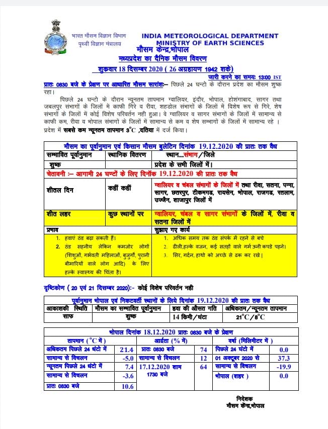 मौसम विभाग (Weather Department) की माने तो अरब सागर और मप्र के मध्य में बना चक्रवात समाप्त हो गया है, फिलहाल कोई वेदर सिस्टम एक्टिव नही है, जिसके चलते हवाओं का रुख उत्तरी और उत्तर-पूर्वी हो गया है और एक सप्ताह तक मौसम शुष्क बने रहने की संभावना है। उत्तर भारत के पहाड़ों से आने वाली बर्फीली हवाओं ने प्रदेश में ठिठुरन बढ़ा दी है।आने वाले दिनों में ठंड के तेवर और सख्त हो सकते है।कई जिलों में शीतलहर तो कही कही पाला पड़ने की भी आशंका है।