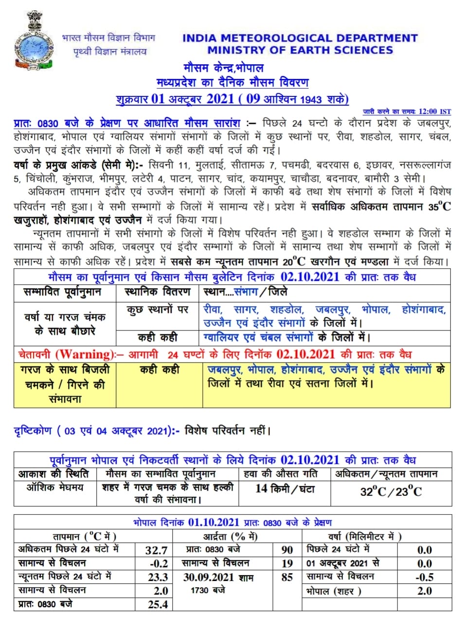 मौसम विभाग (MP Weather Update) ने आज शुक्रवार 1 अक्टूबर 2021 को प्रदेश के इंदौर, उज्जैन, होशंगाबाद, जबलपुर, भोपाल, रीवा, सागर और शहडोल संभागों में कुछ स्थानों पर बारिश ( Rain) की संभावना है। वही ग्वालियर और चंबल में कहीं कही बारिश के आसार है। इसके अलावा भोपाल, इंदौर, उज्जैन, होशंगाबाद और जबलपुर संभागों के साथ रीवा और सतना जिलों में बिजली गिरने और चमकने की चेतावनी जारी करते हुए येलो अलर्ट जारी किया गया है।अबतक हुई बारिश के बावजूद 9 जिले धार, होशंगाबाद, छतरपुर, दमोह, पन्ना, जबलपुर, सिवनी और बालाघाट रेड जोन में है।