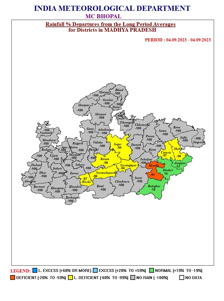 एमपी मौसम विभाग के मुताबिक, सोमवार-मंगलवार आसपास बंगाल की खाड़ी में सक्रिय होने वाले सिस्टम से छह -सात सितंबर तक जबलपुर शहडोल और रीवा सहित आस-पास के क्षेत्र में कम दबाव का क्षेत्र सक्रिय हो सकता है, जिससे 18 सितंबर तक बारिश के आसार है। ग्वालियर-चंबल संभाग में में 5 से 7 सितंबर से हल्की से मध्यम बारिश शुरू हो सकता है, जिसका असर 12 सितंबर तक रहने की संभावना है। नए सिस्टम के असर से जबलपुर, रीवा, सागर और शहडोल संभाग के जिलों में मध्यम से तेज बारिश हो सकती है।