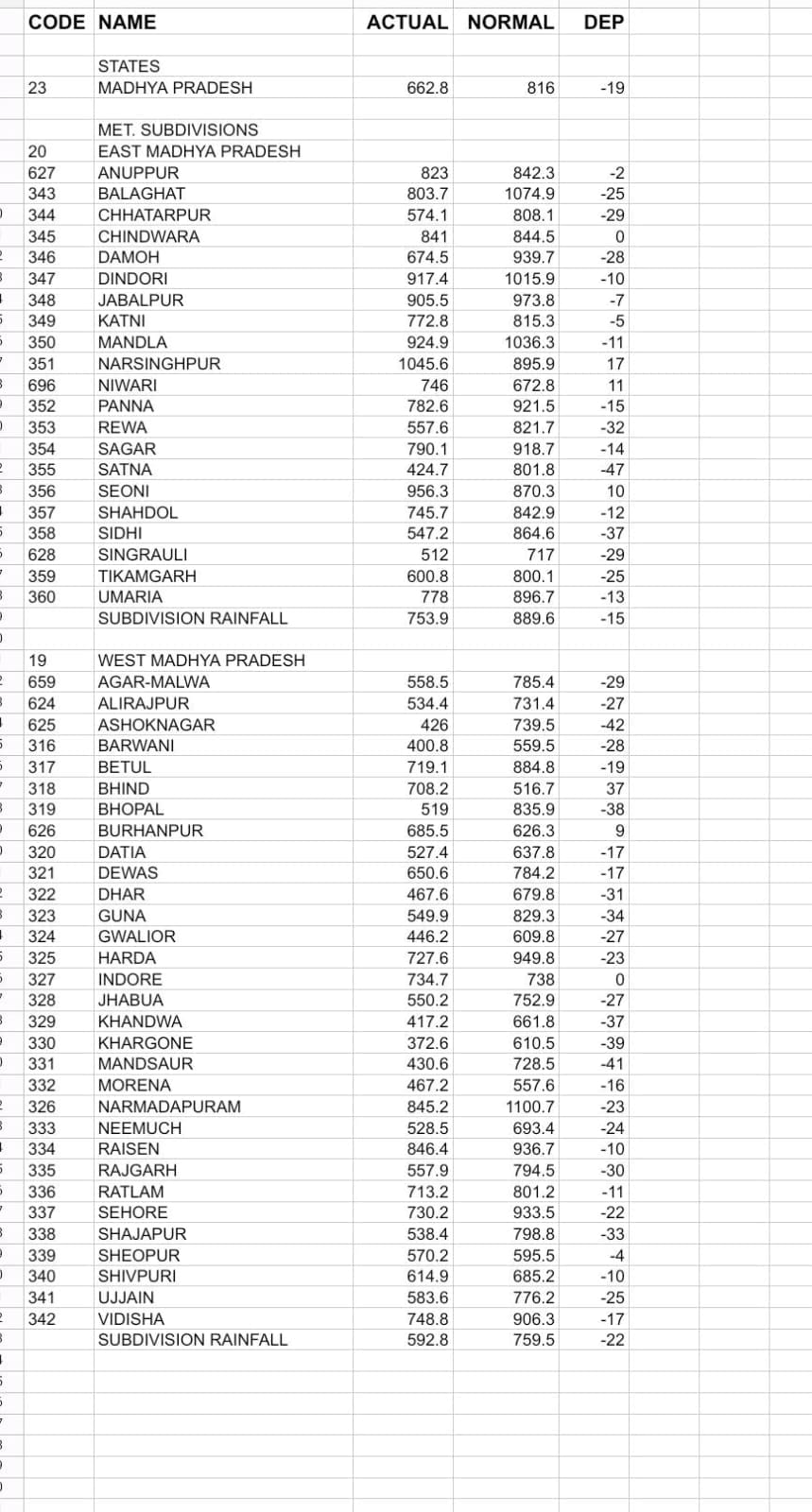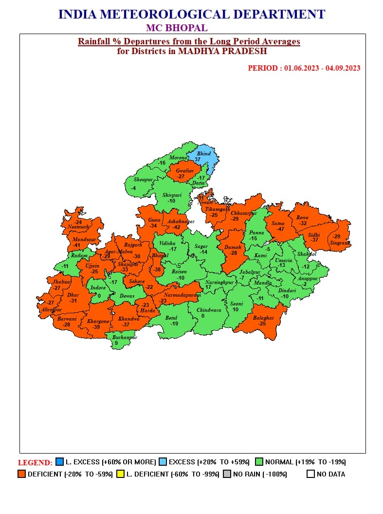एमपी मौसम विभाग के मुताबिक, सितंबर में बंगाल की खाड़ी में बनने वाले दो सिस्टम के कारण इंदौर में भी बारिश की गतिविधियों में पांच सितंबर से तेजी आएगी, इस दौरान इंदौर संभाग में कहीं कहीं भारी बारिश भी हो सकती है। वर्तमान में बंगाल की खाड़ी के उत्तरी पश्चिमी हिस्से में चक्रवाती हवा को घेरा बना हुआ है,वो मंगलवार को निम्न दाब क्षेत्र में तब्दील होगा, वहीं 12 सितंबर को भी बंगाल की खाड़ी में चक्रवाती हवाओं का घेरा बनेगा, जुससे इंदौर जिले में अच्छी वर्षा होगी।ग्वालियर में पांच सितंबर से रुक-रुककर तो छह दिन से मध्यम बारिश का सिलसिला शुरू हो सकता है।
