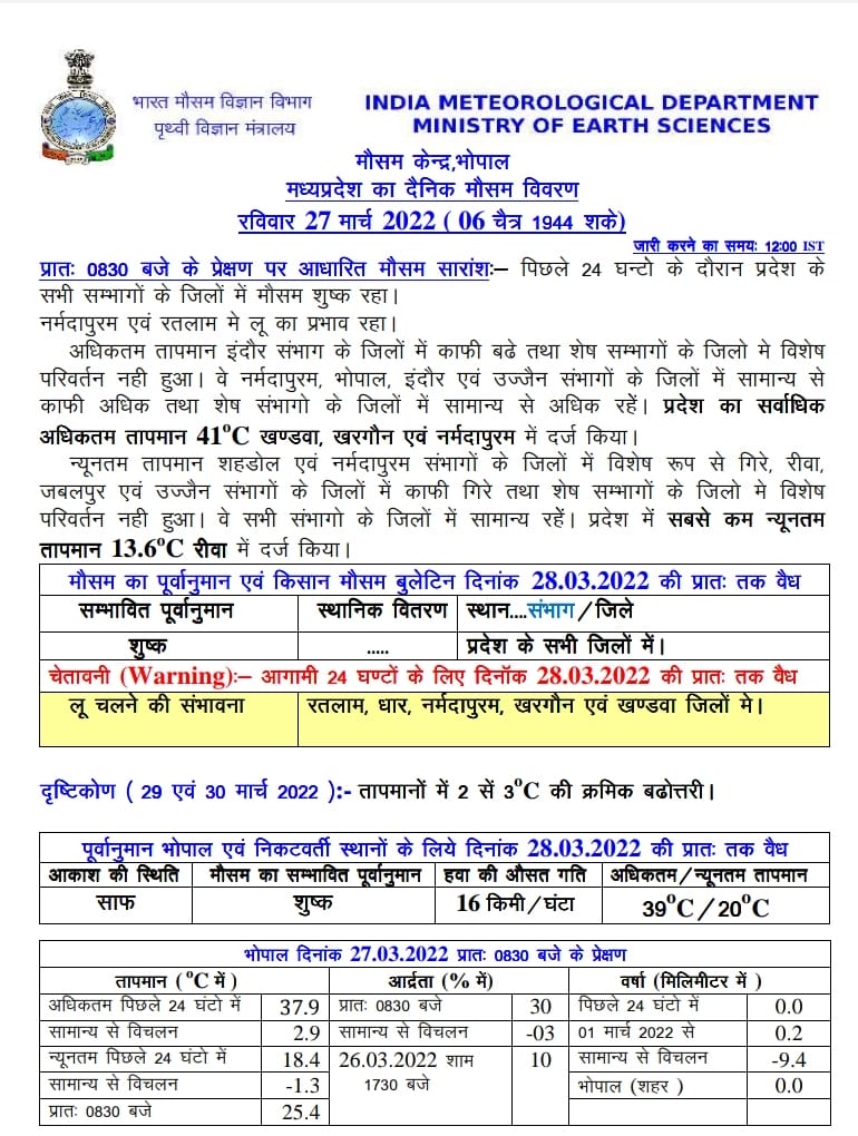 एमपी मौसम विभाग (MP Weather Report) के अनुसार, आज 27 मार्च 2022 को 5 जिलों रतलाम, धार, नर्मदापुरम, खरगोन और खंडवा में लू चलने का येलो अलर्ट जारी किया गया है। पिछले 24 घंटे में सबसे न्यूनतम तापमान 13.6 डिग्री रीवा में दर्ज किया गया वही सबसे अधिकतम तापमान 41 डिग्री सेल्सियस खरगोन, खंडवा और नर्मदापुरम में दर्ज किया गया है।पिछले 24 घंटे में रतलाम और नर्मदापुरम में लू का असर देखने को मिला।जबलपुर में 28 और 29 मार्च से तापमान में तेजी से बढ़ेगा। राजस्थान की तरफ से आने वाली गर्म हवाओं के कारण लू चलने की भी संभावना है।
