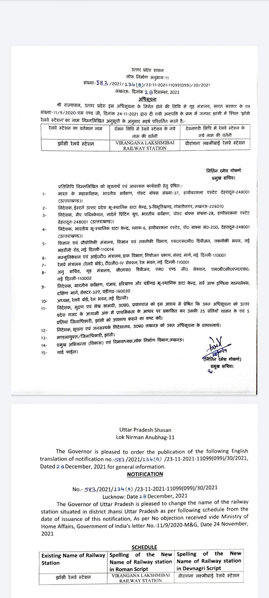 रेलवे के अधिकारियों की माने तो रेल मंत्रालय को आदेश मिलते ही रेल प्रशासन द्वारा नाम बदलने की विभागीय प्रक्रिया शुरू कर दी जाएगी। इतना ही नहीं नाम बदलने के साथ-साथ स्टेशन का कोड भी बदला जाएगा। बता दें कि उत्तर प्रदेश सरकार द्वारा झांसी रेलवे स्टेशन का नाम बदलने का प्रस्ताव 3 महीने पहले ही गृह मंत्रालय के पास भेजा गया था।