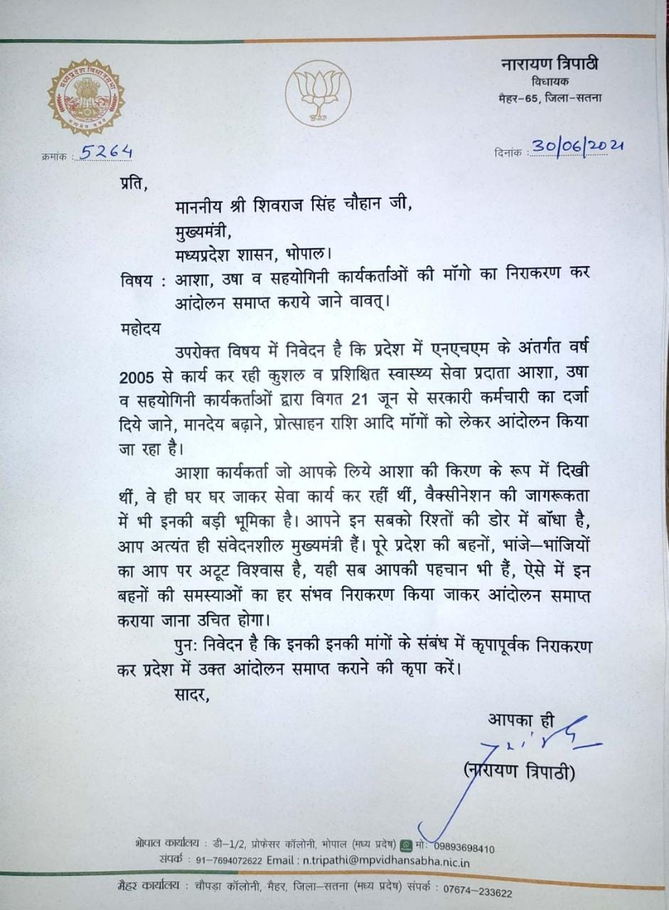 दरअसल, अपनी 6 सुत्रीय मांगों को लेकर मप्र सरकार (MP Government) के खिलाफ मोर्चा खोलने वाली आशा-उषा कार्यकर्ताओं को अब सतना के मैहर से बीजेपी विधायक नारायण त्रिपाठी का समर्थन मिल गया है।नारायण त्रिपाठी ने उनकी मांगों को पूरा करने के लिए मुख्यमंत्री शिवराज सिंह चौहान (CM Shivraj Singh Chouhan) को पत्र लिखा है।