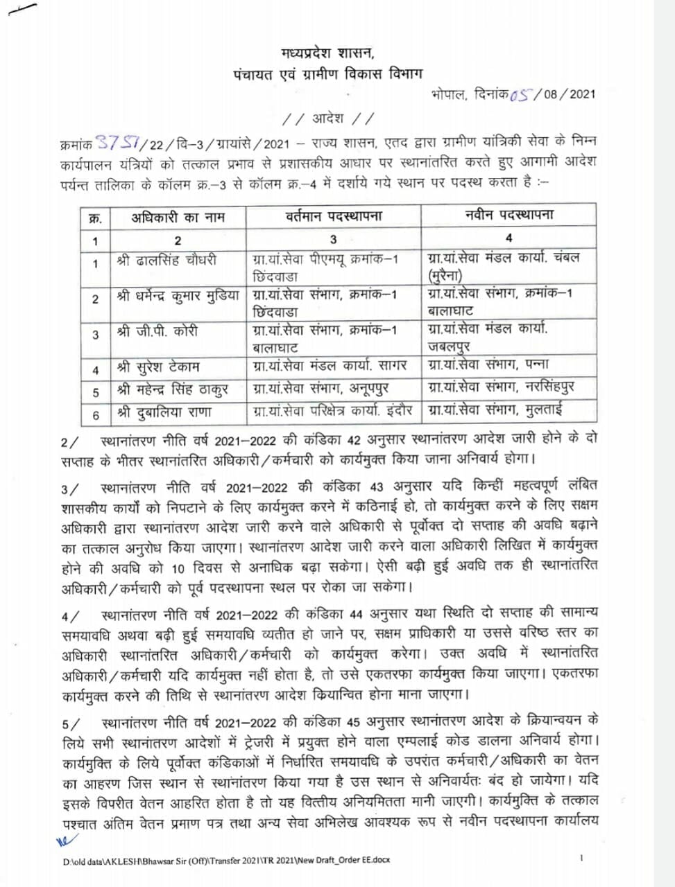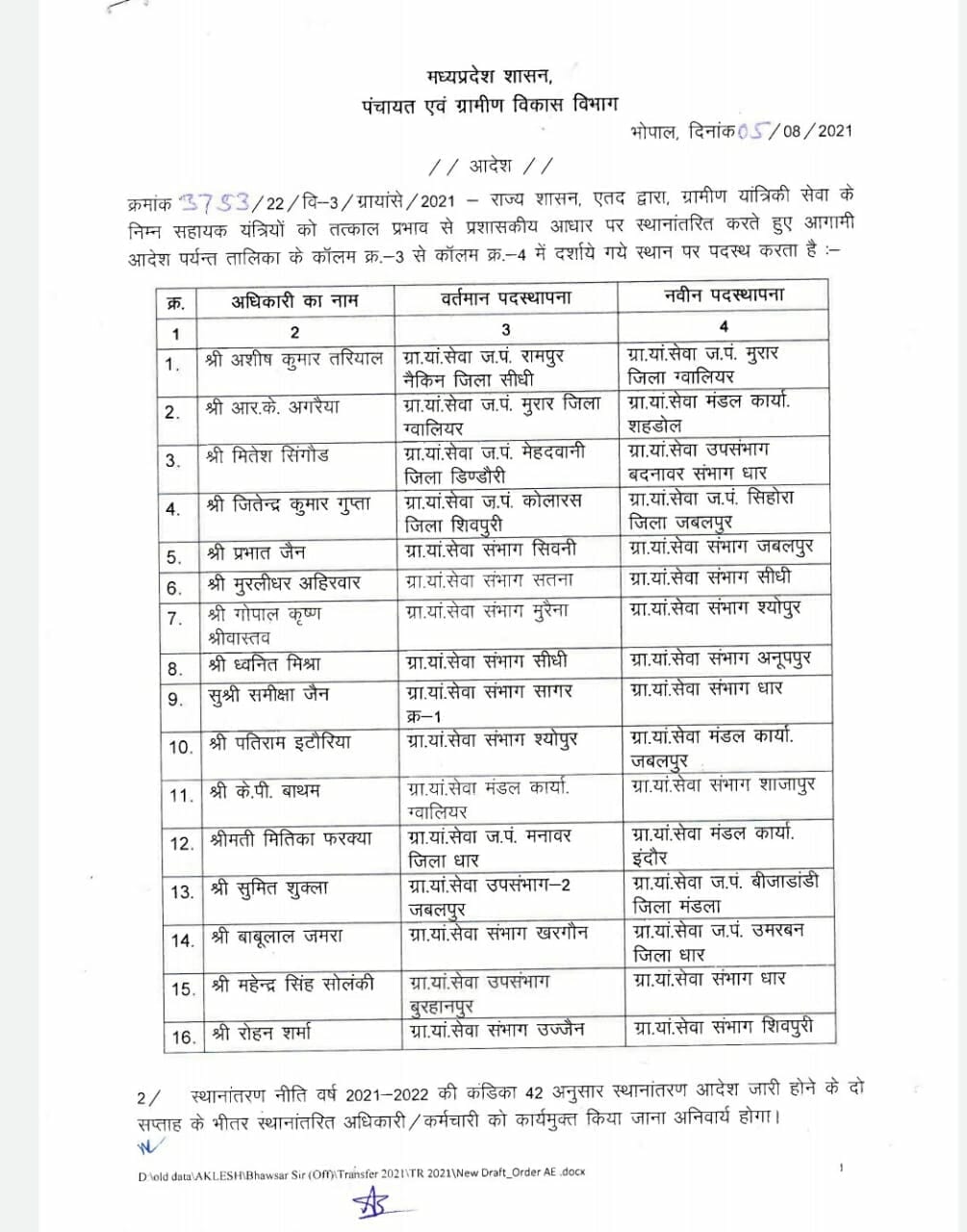 भोपाल, डेस्क रिपोर्ट। मध्यप्रदेश शासन (MP Government) के पंचायत एवं ग्रामीण विकास विभाग (Panchayat and Rural Development Department) ने एक साथ दो तबादला (Transfer) सूची जारी की है। पहली लिस्ट में ग्रामीण यांत्रिकी सेवा के 16 सहायक यंत्री यों के तबादले किए गए हैं जबकि दूसरी लिस्ट में ग्रामीण यांत्रिकी सेवा की 6 कार्यपालन यंत्री के तबादले किए गए हैं। इस संबंध में पंचायत एवं ग्रामीण विकास विभाग, मप्र शासन ने आदेश जारी कर दिए है।