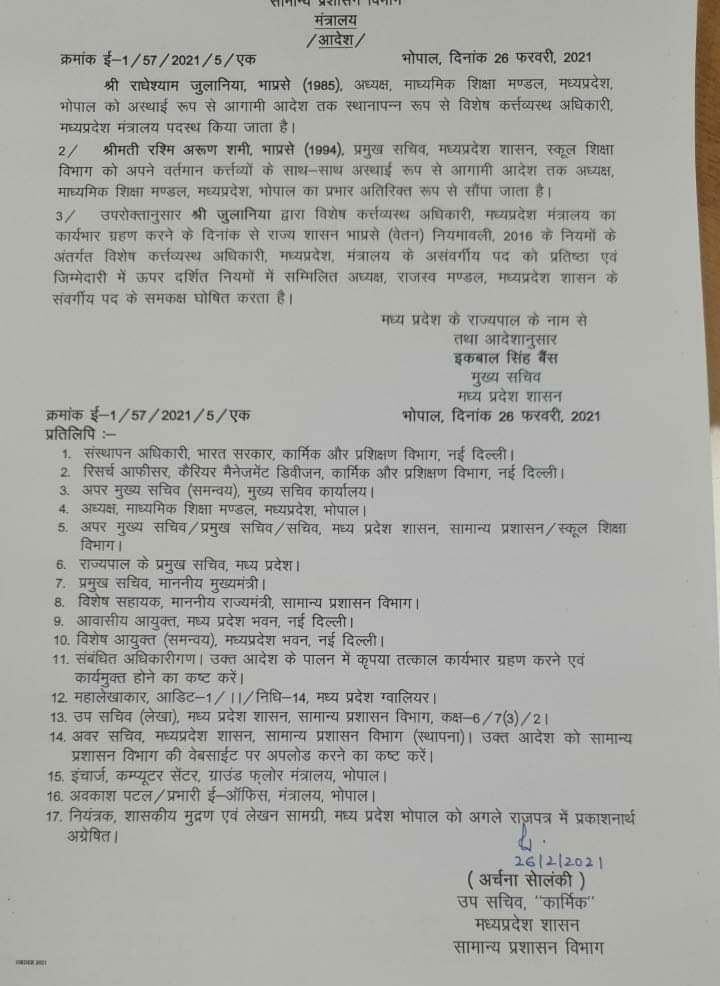 भोपाल, डेस्क रिपोर्ट। रश्मि अरूण शमी को माध्यमिक शिक्षा मंडल (MP Board of Secondary Education) का अध्यक्ष बनाया गया है। इसी के साथ उनके पास स्कूल शिक्षा विभाग के प्रमुख सचिव का प्रभार भी रहेगा। वहीं सीनियर आईएएस अधिकारी (IAS) राधेश्याम जुलानिया को अध्यक्ष पद से हटा दिया गया है। अब उन्हें माध्यमिक शिक्षा मंडल भोपाल में विशेष कर्तव्य अधिकारी के रूप में पदस्थ किया गया है। इसे लेकर सामान्य प्रशासन विभाग द्वारा आदेश जारी कर दिया गया है।