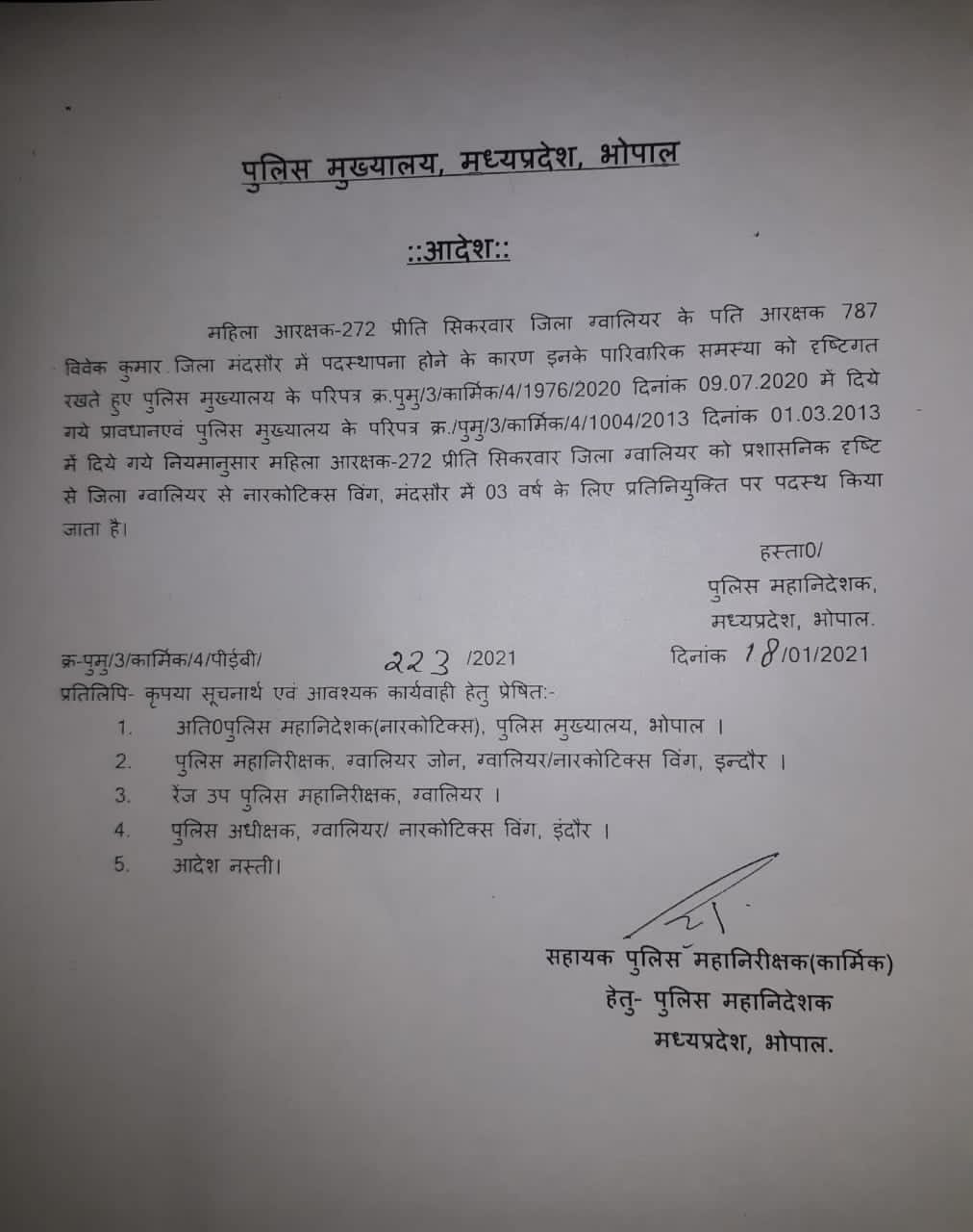 इसके बाद पुलिस मुख्‍यालय द्वारा ग्‍वालियर में कांस्‍टेबल प्रीति सिकरवार का तबादला उनके पति विवेक की नियुक्ति वाले शहर मंदसौर में कर दिया गया है। जारी आदेश में पारिवारिक समस्‍याओं को देखते हुए उनका तबादला मंदसौर की नारकोटिक्‍स विंग में किया गया है।