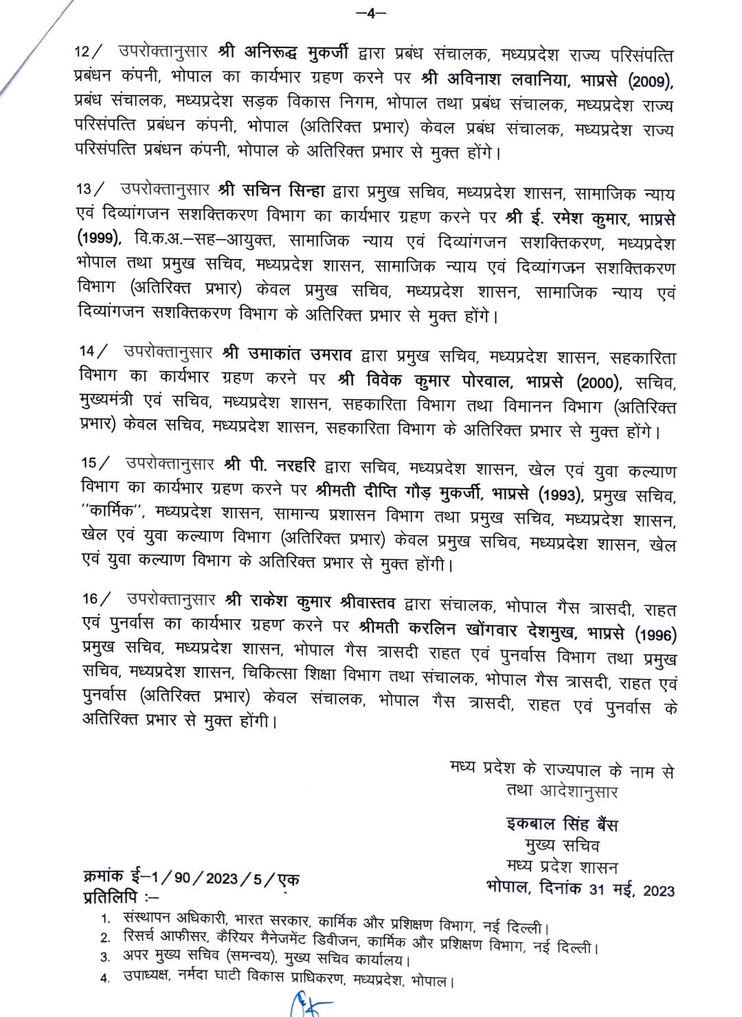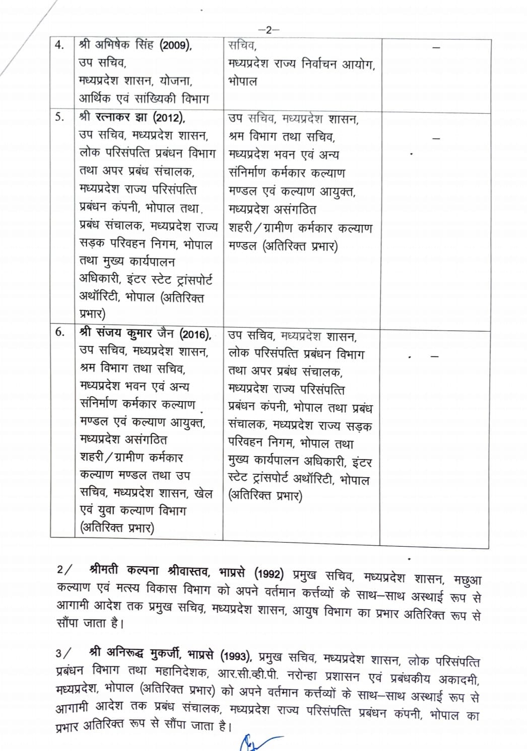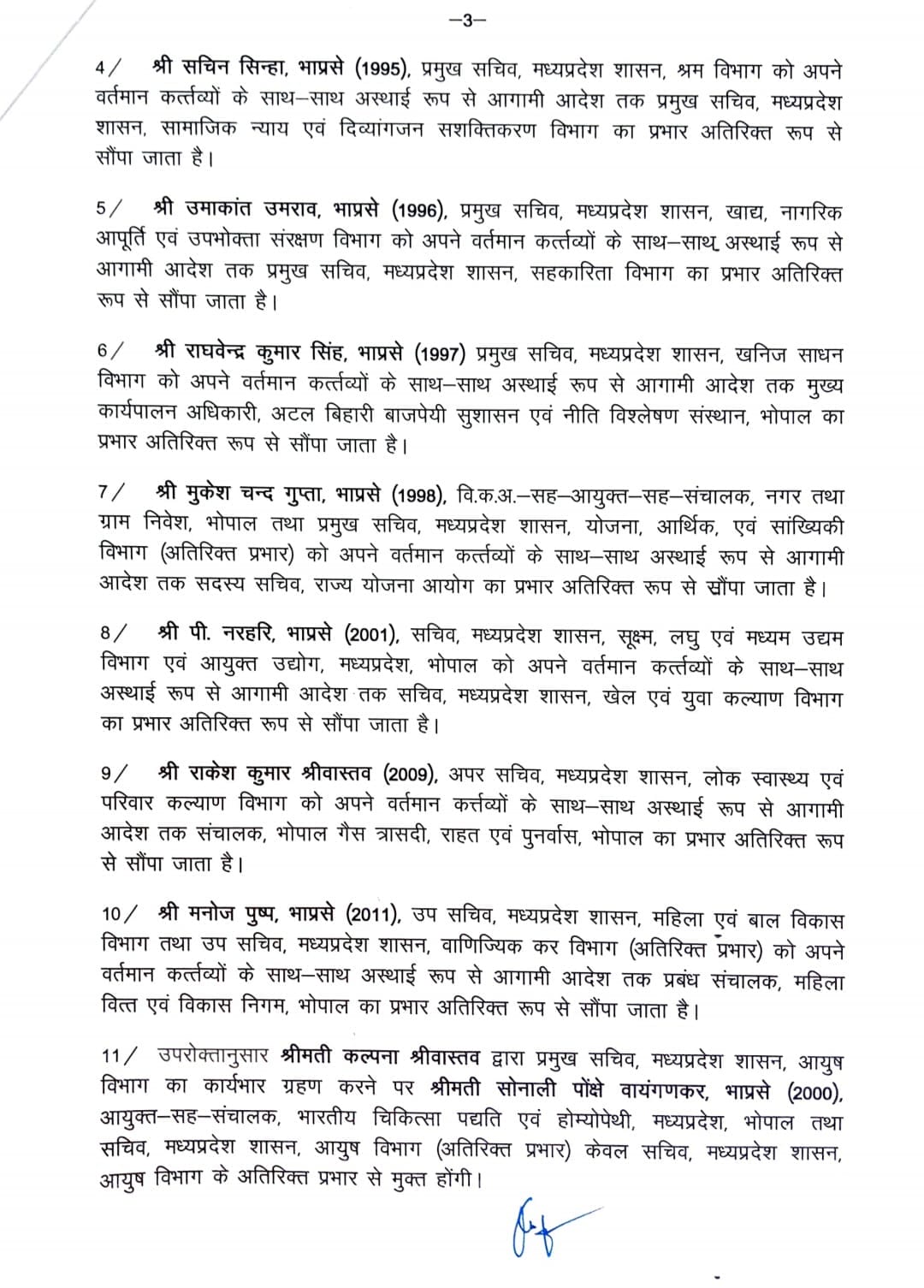 शासन ने इसके अतिरिक्त IAS कल्पना श्रीवास्तव, अनिरुद्ध मुकर्जी, सचिन सिन्हा, उमाकांत उमराव, राघवेन्द्र कुमार सिंह, मुकेश चन्द्र गुप्ता, पी नरहरि, राकेश कुमार श्रीवास्तव और मनोज पुष्प को उनके वर्तमान दायित्वों के साथ साथ अतिरिक्त प्रभार भी सौंपा है।