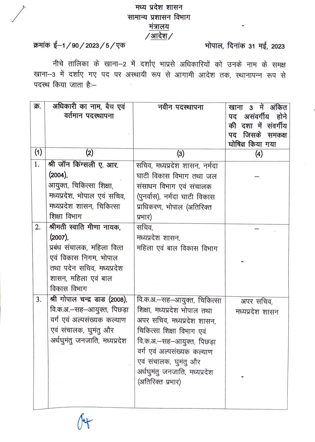आज 31 मई 2023 को जारी तबादला सूची में शामिल IAS जॉन किंग्सली ए आर, श्रीमती स्वाति मीणा नायक, गोपाल चन्द्र डाड, अभिषेक सिंह, रत्नाकर झा, संजय कुमार जैन को नई जगह भेजा गया है ।