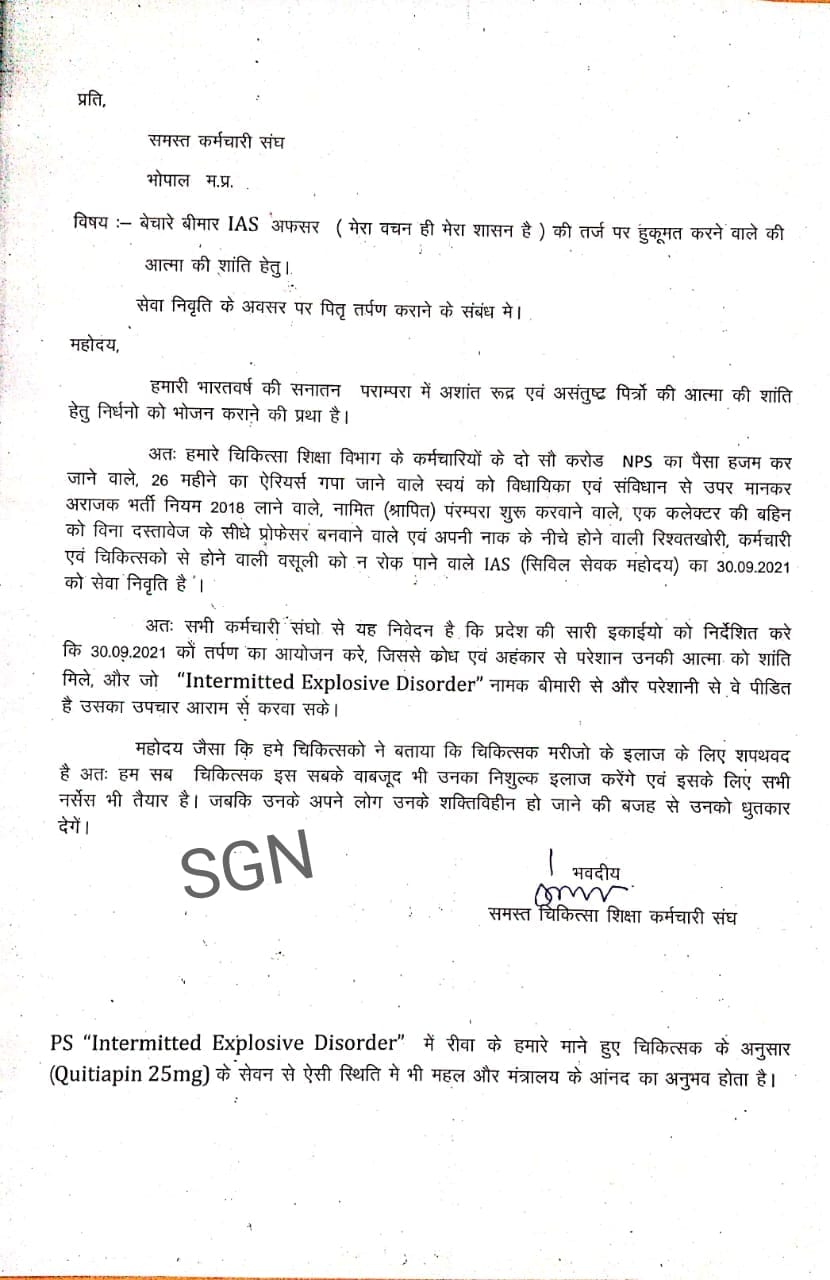 इसमें प्रदेश के सभी कर्मचारी संघ को संबोधित करते हुए लिखा गया है कि हमारी भारतवर्ष की सनातन परंपरा में अशांत रूद्र एवं असंतुष्ट पितरों की आत्मा की शांति के लिए निर्धनों को भोजन कराने की प्रथा है।अतः हमारे चिकित्सा शिक्षा विभाग के कर्मचारियों के 200 करोड़ NPS का पैसा हजम करने वाले, 26 महीने का एरियर पचा जाने वाले, स्वयं को विधायिका एवं संविधान से ऊपर मानकर अराजक भर्ती नियम 2018 लाने वाले, श्रापित परंपरा शुरू करवाने वाले, एक कलेक्टर की बहन को बिना दस्तावेज के सीधे प्रोफेसर बनाने वाले एवं अपनी नाक के नीचे होने वाली रिश्वतखोरी कर्मचारी एवं चिकित्सकों से होने वाली वसूली को न रोक पाने वाले IAS महोदय का 20 सितंबर को रिटायरमेंट है।
