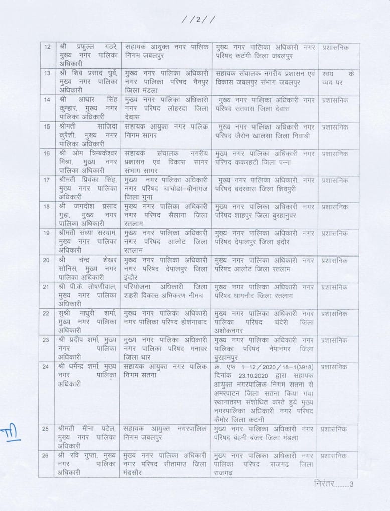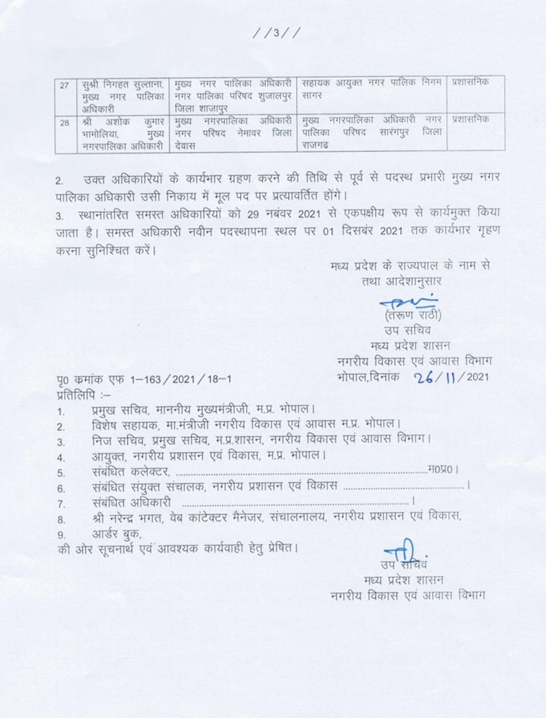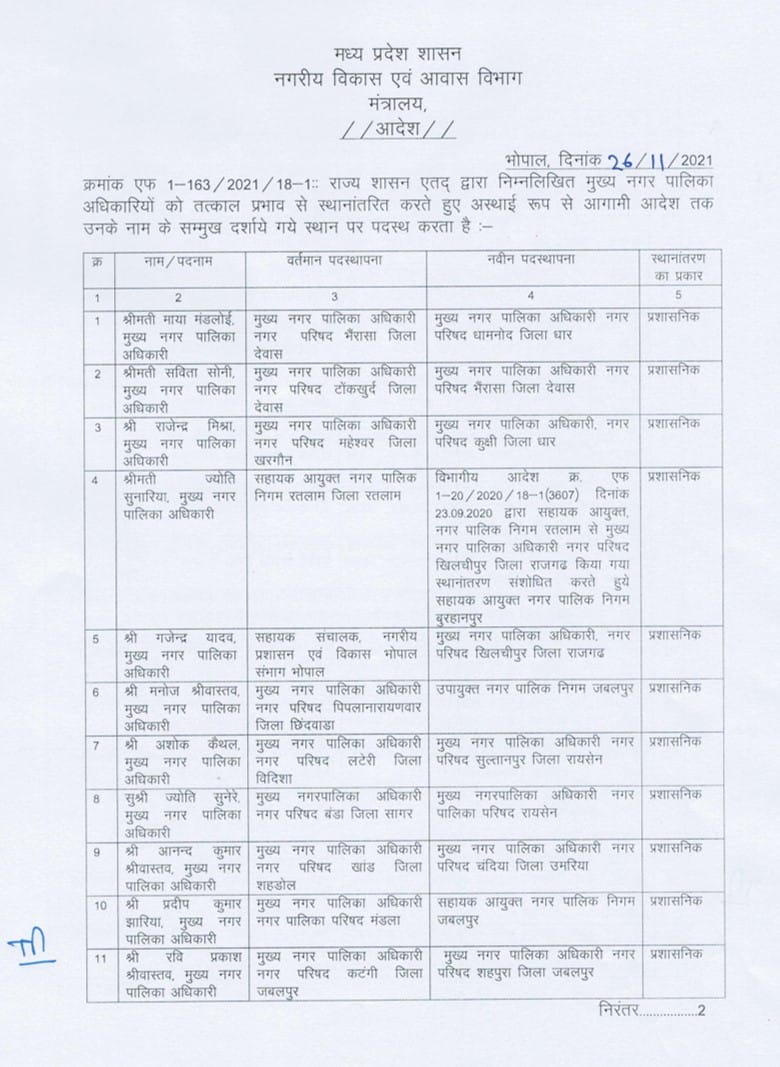 भोपाल, डेस्क रिपोर्ट। मध्य प्रदेश में पंचायत चुनाव से पहले तबादलों (MP Transfer) का दौर तेजी से चल रहा है।अब राज्‍य शासन के नगरीय विकास एवं आवास विभाग (MP Urban Development and Housing Department) ने 28 मुख्‍य नगर पालिका अधिकारियों के तबादले किए है, इस संबंध में आदेश जारी किये हैं।