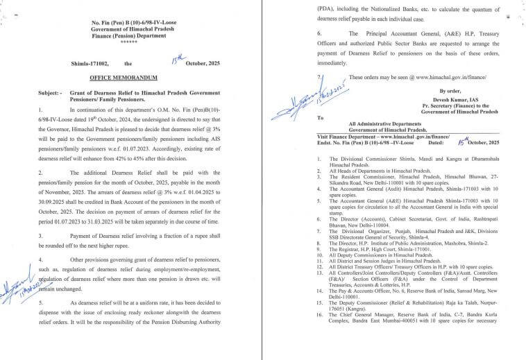 HP Employees Pensioner DA Hike :केन्द्र के बाद अब दिवाली से पहले हिमाचल प्रदेश की सुखविंदर सिंह सुक्खू सरकार ने भी राज्य के सरकारी कर्मचारियों का महंगाई भत्ता 3 फीसदी बढ़ा दिया है। बढ़ा हुआ महंगाई भत्ता कर्मचारियों को नवंबर में देय अक्तूबर के वेतन व पेंशन में जोड़कर भेजा जाएगा।इसके अलावा 1 अप्रैल से सितंबर 2025 तक एरियर की राशि प्रदेश के सभी विभागों के करीब सवा दो लाख सरकारी कर्मचारियों और पौने दो लाख पेंशनरों के खातों में भेज दी गई है।। इसके तहत कर्मचारियों के खाते में 8 हजार से लेकर 40 हजार रुपये तक भेजे गए है।इधर,जुलाई 2023 से मार्च 2025 तक की महंगाई भत्ते के बकाय की अदायगी के लिए अलग से जल्द फैसला लेकर अधिसूचना जारी की जाएगी।
