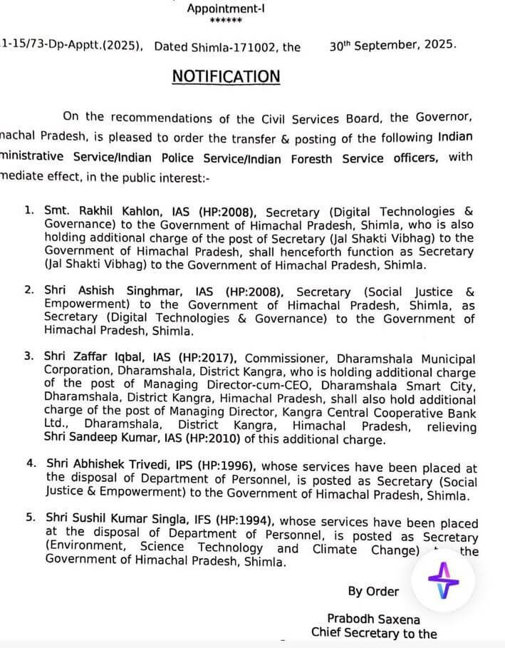 हिमाचल प्रदेश IAS-IPS-IFS के तबादले