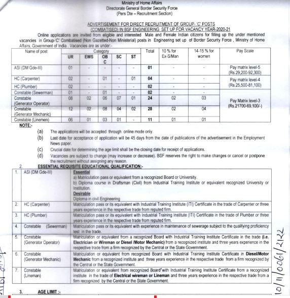 इस भर्ती में 10वीं पास या इसके समकक्ष परीक्षा पास और आईटीआई सर्टिफिकेट (ITI Certificate) रखने वाले अभ्यर्थी आवेदन कर सकते हैं। आवेदन करने की अंतिम तिथि रोजगार समाचार पत्र पर प्रकाशित भर्ती विज्ञापन के 45 दिनों के भीतर किए जा सकते हैं। BSF ग्रुप सी कैटेगरी के पदों पर भर्ती के लिए आवेदन ऑनलाइन ही स्वीकार किए जाएंगे। BSF ग्रुप सी भर्ती के तहत इंजीनियरिंग विंग में ज्वाइनिंग मिलेगी।