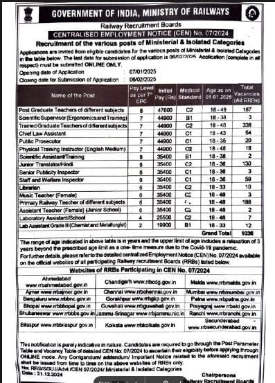 Indian Railway Recruitment 2025: भारतीय रेलवे में नौकरी पाने का बेहतरीन मौका है। रेलवे भर्ती बोर्ड (RRB) ने 2025 के लिए विभिन्न पदों पर भर्ती के लिए विज्ञापन जारी किया है।ऑनलाइन आवेदन प्रक्रिया 7 जनवरी 2025 से शुरू होगी। उम्मीदवार 6 फरवरी 2025 तक आवेदन कर सकेंगे।