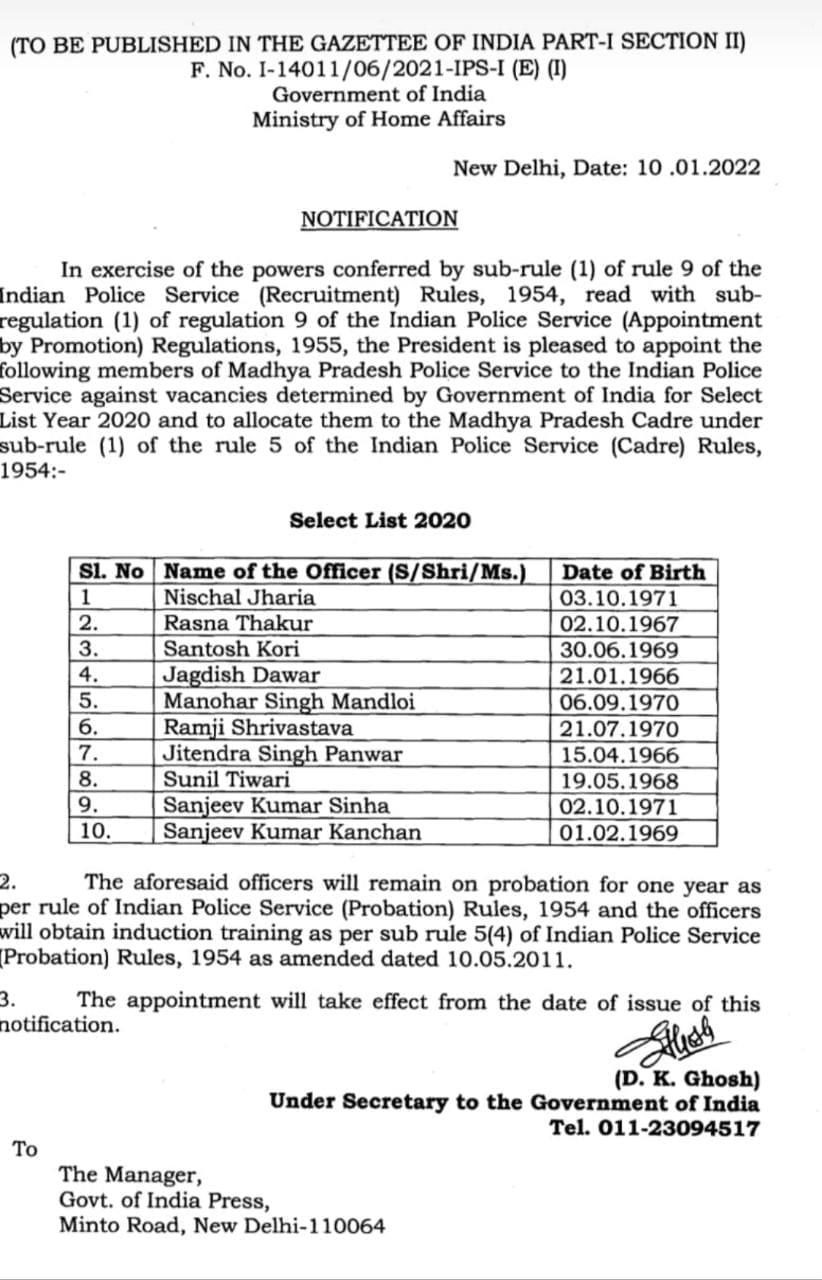 भोपाल, डेस्क रिपोर्ट। मध्य प्रदेश के 10 राज्य पुलिस सेवा के अधिकारी पदोन्नत होकर बने IPS बन गए है, केंद्र सरकार के गृह मंत्रालय से आदेश जारी किया गया है। भारत सरकार ने सोमवार को नोटिफिकेशन जारी करते हुए राज्य पुलिस सेवा के इन अधिकारियों को आईपीएस अवार्ड कर दिया है। इन सभी अधिकारियों को मध्यप्रदेश कैडर आवंटित किया गया है। देखिए जारी सूची ….