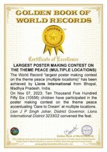 BHOPAL NEWS : भोपाल में लायंस क्लब इंटरनेशनल की डिस्ट्रिक्ट 3233G2 के द्वारा गुरुवार को स्वराज वीथि में पीस पर आधारित इंटरनेशनल प्रतियोगिता में चयनित पोस्टरों की एक दिवसीय प्रदर्शनी का उद्घाटन लायंस के डिस्ट्रिक्ट गवर्नर लायन जे पी सिंह जौहर के मुख्य आतिथ्य में तथा डीसी पीस पोस्टर लायन बीनू गर्ग के सभापतित्व में किया गया। इस अवसर पर गोल्डन बुक ऑफ रिकॉर्ड का प्रमाण पत्र प्रदान किया।