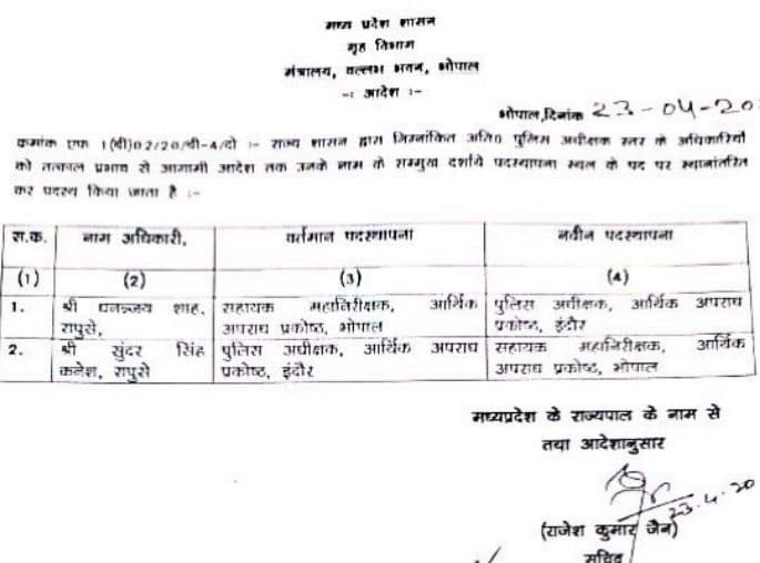 भोपाल| प्रदेश में कोरोना संकट के खिलाफ जारी जंग के बीच राज्य शासन ने एक बार फिर फेरबदल किया है| गुरूवार को अतिरिक्त पुलिस अधीक्षक स्तर के दो अफसरों के तबादले आदेश जारी किये गए हैं| गृह विभाग द्वारा जारी आदेश के मुताबिक धनंजय शाह को अधीक्षक, आर्थिक अपराध प्रकोष्ठ (EOW) इंदौर बनाया गया है| धनजय शाह भाजपा विधायक व पूर्व मंत्री विजय शाह और विधायक संजय शाह के भाई हैं| इसके अलावा सुन्दर सिंह को एसपी EOW से सहायक महानिरीक्षक, EOW भोपाल पदस्थ किया है|