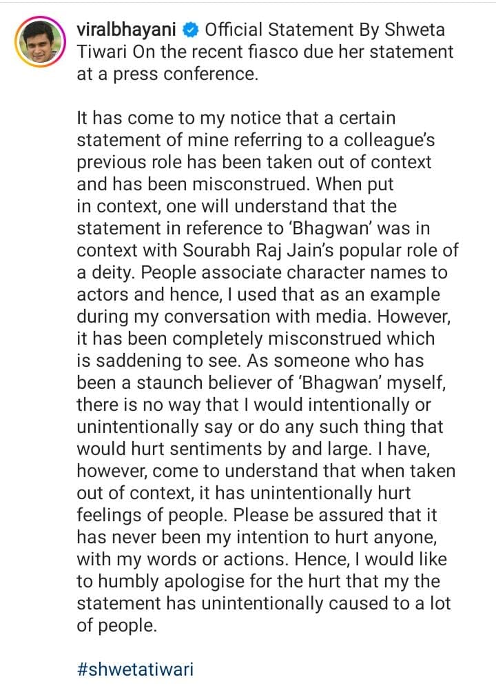 इस मामलें पर सफाई देते हुए श्वेता तिवारी ने कहा है कि उन्होंने अपने एक सहयोगी की पिछली भूमिका के संदर्भ के साथ कमेंट किया था। इसे गलत समझा गया। उन्होंने कहा है कि भगवान के संदर्भ में बयान अपने सहयोगी सौरभ राज जैन की एक देवता की लोकप्रिय भूमिका के साथ किया था। श्वेता ने कहा कि लोग किरदारों के नामों को अभिनेताओं से जोड़ते हैं और इसलिए मैंने के साथ अपनी बातचीत के दौरान इसे एक उदाहरण के रूप में इस्तेमाल किया था। उन्होंने कहा कि इसे गलत समझा गया जो दुखद है। यही नहीं अभिनेत्री श्वेता तिवारी ने यह भी कहा कि उनका भगवान में अटूट विश्वास है। वे जानबूझकर या अनजानें में भी किसी की धार्मिक भावनाओं को ठेस नहीं पहुंचाना चाहती। भगवान शब्द को संदर्भ से बाहर किए जाने से अनजाने में लोगों की भावनाओं को ठेस पहुंची और उन्होंने आश्वास्त किया है कि उनके शब्दों या कामों से किसी को चोट पहुंचाने का कभी कोई इरादा नहीं रहा है और अगर अनजाने में उनसे ऐसा हुआ है तो वह माफी मांगती है।