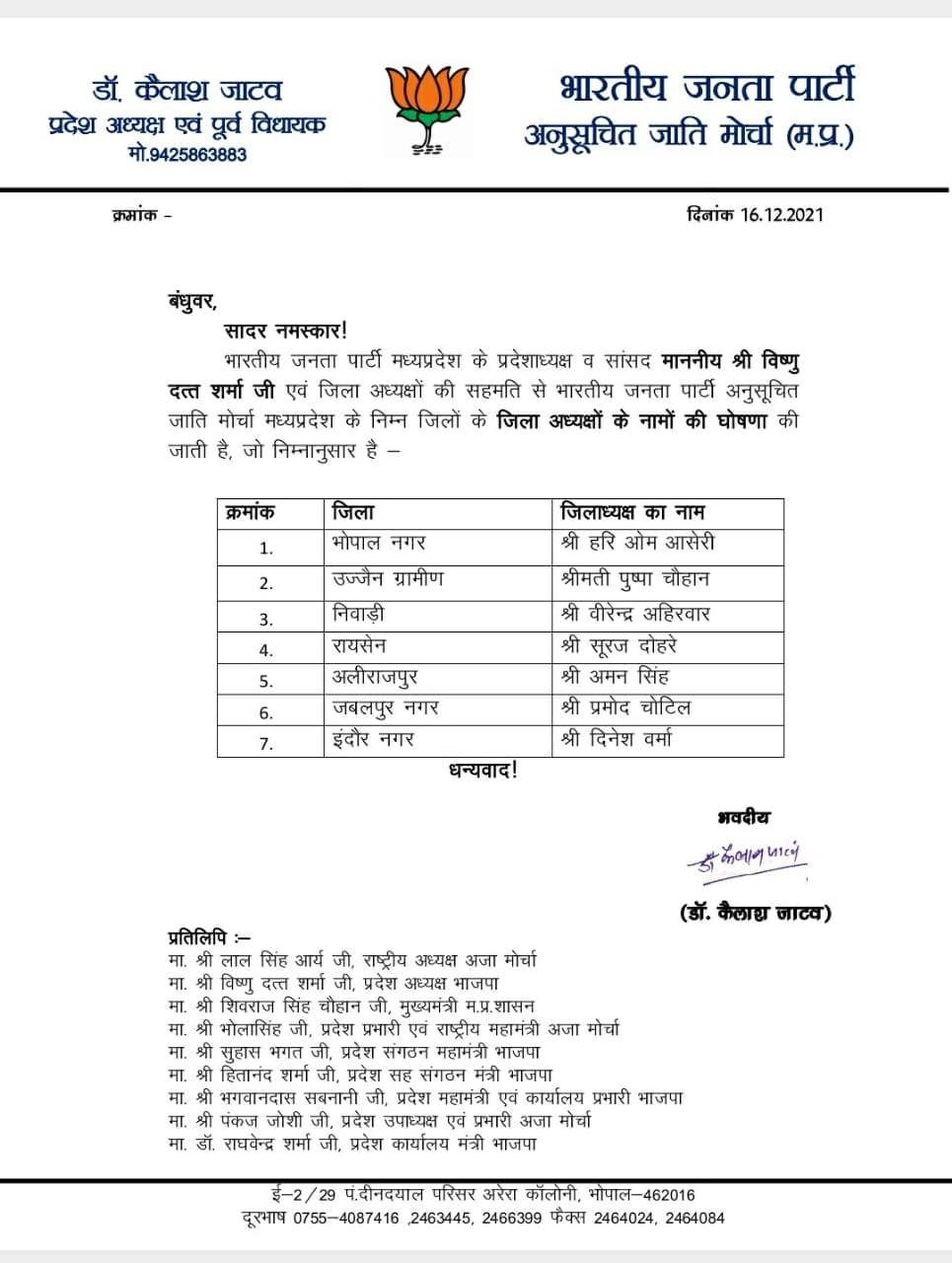 भोपाल, डेस्क रिपोर्ट। मध्य प्रदेश पंचायत चुनाव (MP Panchayat Election 2021) की हलचल के बीच बीजेपी में नियुक्तियों का सिलसिला जारी है। भाजपा प्रदेश अध्यक्ष वीडी शर्मा (VD Sharma) की सहमति से अनुसूचित जाति मोर्चा के प्रदेश अध्यक्ष और पूर्व विधायक डॉ कैलाश जाटव द्वारा अनुसूचित जाति मोर्चा के 7 जिलों के जिला अध्यक्षों (district presidents) की घोषणा की गई।