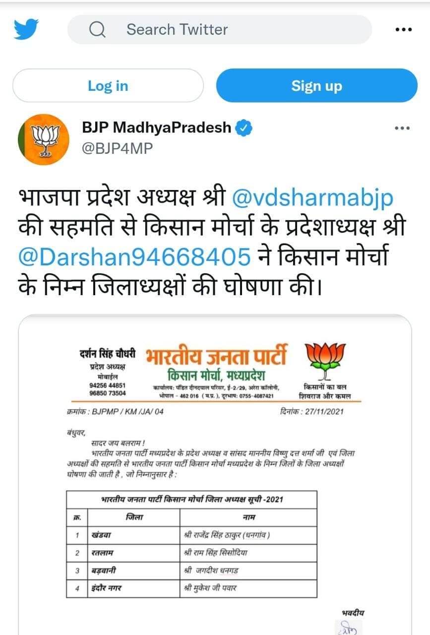 भोपाल, डेस्क रिपोर्ट। मध्य प्रदेश में भारतीय जनता पार्टी ने किसान मोर्चा के जिलाध्यक्षों के नाम घोषणा कर दी है। पार्टी ने खंडवा, रतलाम,बड़वानी और इंदौर नगर के जिलाध्यक्षों के नामों की सूची जारी की है। प्रदेश अध्यक्ष वी डी शर्मा और किसान मोर्चा के प्रदेश अध्यक्ष की सहमति के बाद नामों की घोषणा की गई।