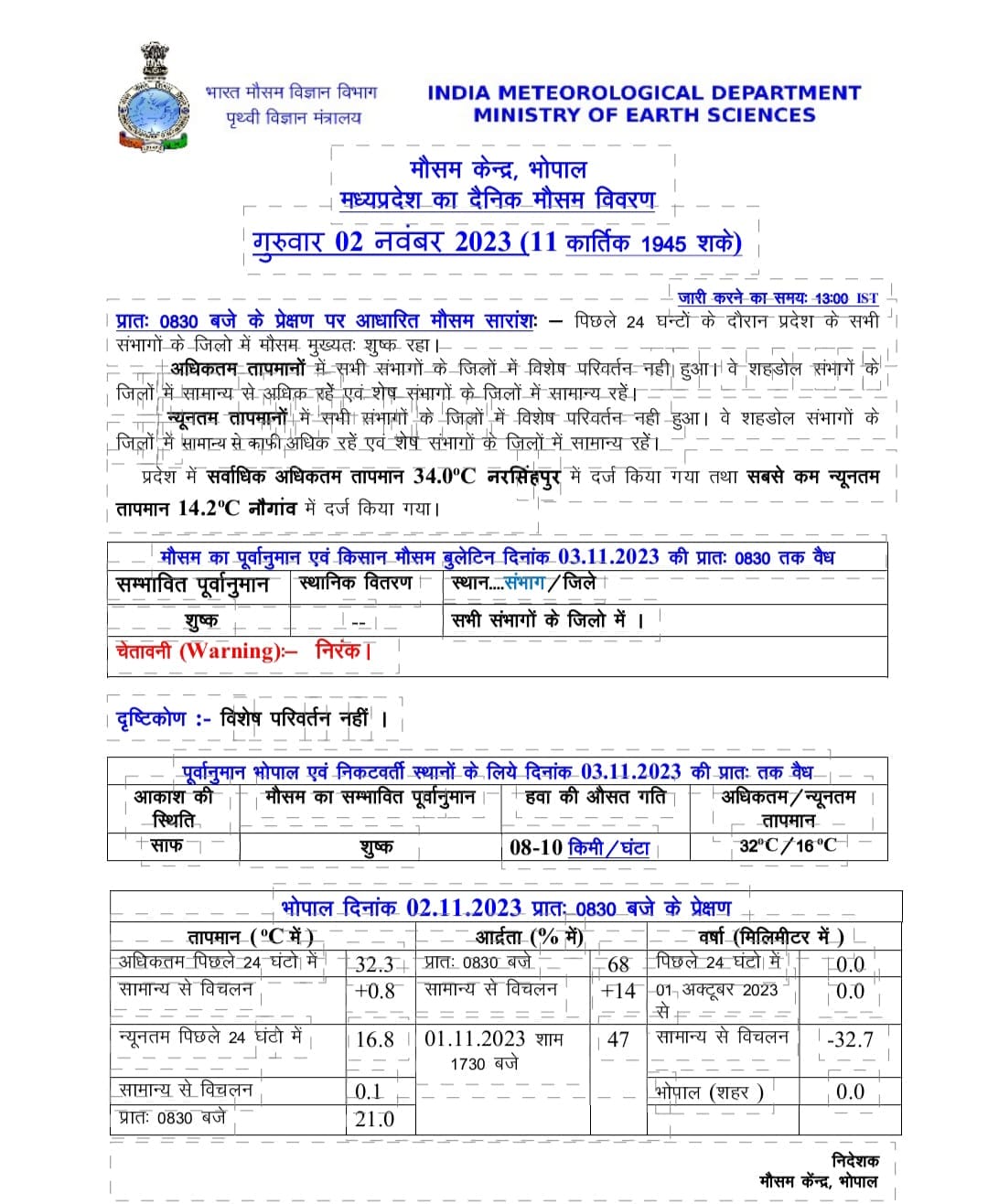 पिछले 24 घंटो की यदि बात की जाये तो प्रदेश के सभी संभागों में मौसम शुष्क ही रहा , सभी संभागों के जिलों में अधिकतम तापमान में कोई विशेष परिवर्तन नहीं हुआ इसी तरह न्यूनतम तापमान में भी बहुत विशेष परिवर्तन दिखाई नहीं दिया, प्रदेश में सर्वाधिक अधिकतम तापमान 34 डिग्री सेल्सियस नरसिंहपुर में दर्ज किया गया जबकि सबसे कम न्यूनतम तापमान 14.2 डिग्री सेल्सियस नौगांव में दर्ज किया गया। मौसम विभाग की माने तो आने वाले 24 घंटों में कोई विशेष अंतर मध्य प्रदेश के मौसम में दिखाई नहीं दे रहा है।