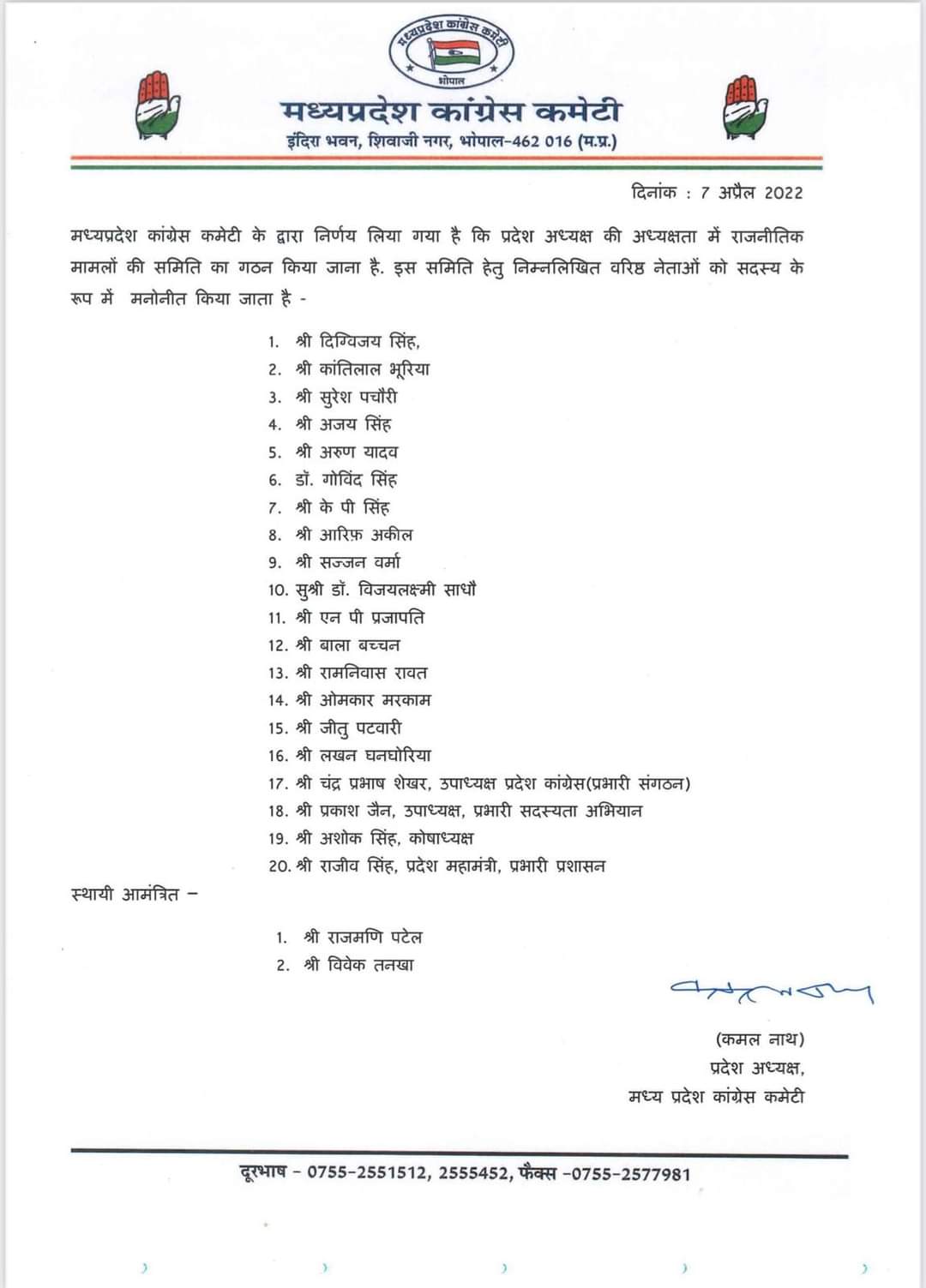 भोपाल, डेस्क रिपोर्ट। वर्ष 2023 के विधानसभा चुनाव के लिए कांग्रेस ने खासी तैयारियां शुरू कर दी है और इसी के चलते मध्य प्रदेश कांग्रेस ने राजनीतिक मामलों की समिति का गठन किया है। इस समिति का अध्यक्ष कमल नाथ ओ बनाया गया है। वही पूर्व मुख्यमंत्री दिग्विजय सिंह, अरुण यादव सहित प्रदेश के सभी वरिष्ठ नेताओं को समिति में शामिल किया गया है। वही समिति में राज्य सभा सदस्य विवेक तन्खा और राजमणि पटेल को समिति का स्थायी आमंत्रित सदस्य बनाया, कांतिलाल भूरिया, सुरेश पचौरी, अजय सिंह, डा.गोविन्द सिंह, केपी सिंह, आरिफ अकील, सज्जन सिंह वर्मा, डा.विजय लक्ष्मी साधौ, एनपी प्रजापति, बाला बच्चन, रामनिवास रावत, ओमकार मरकाम, जीतू पटवारी, लखन घनघोरिया, चंद्रप्रभाष शेखर, प्रकाश जैन, अशोक सिंह और राजीव सिंह को सदस्य बनाया गया है।