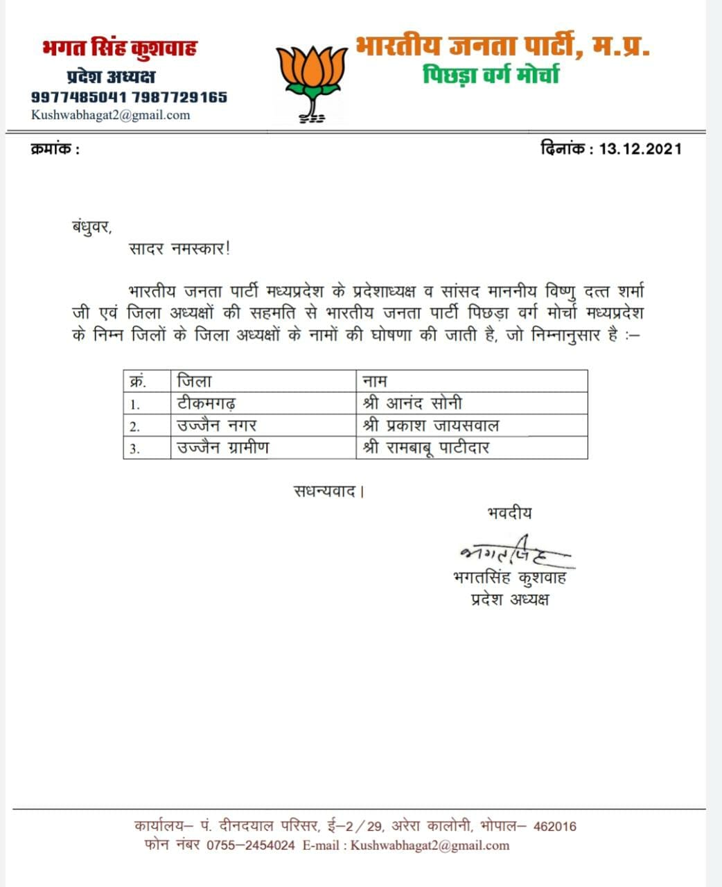 भोपाल, डेस्क रिपोर्ट। भारतीय जनता पार्टी (BJP) के प्रदेश अध्यक्ष व सांसद विष्णुदत्त शर्मा की सहमति से पिछड़ा वर्ग मोर्चा के प्रदेश अध्यक्ष भगतसिंह कुशवाह ने पिछड़ा वर्ग मोर्चा के जिलाध्यक्षों की घोषणा की है। देखिये लिस्ट …