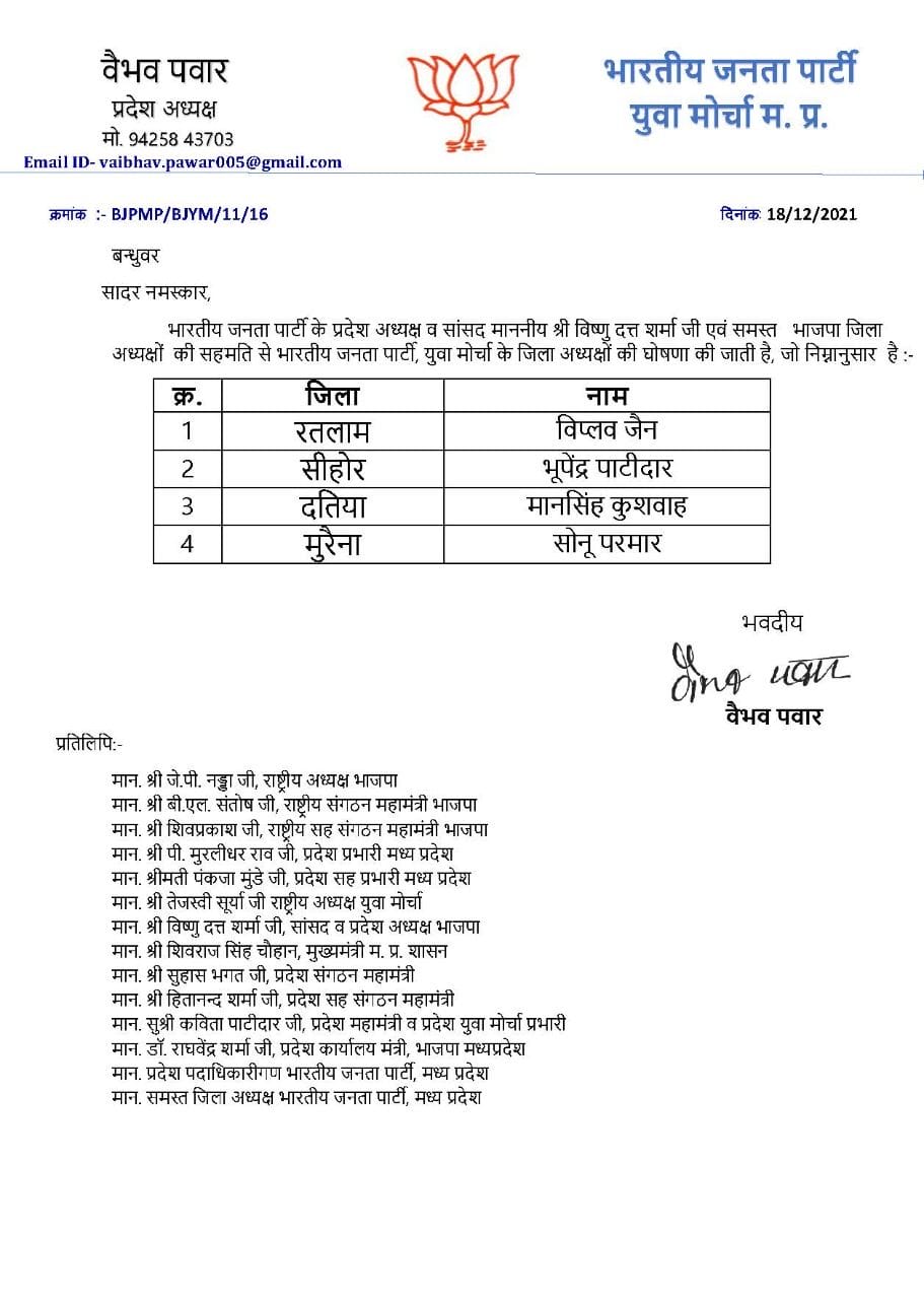 भोपाल, डेस्क रिपोर्ट। भारतीय जनता पार्टी के मध्य प्रदेश के अध्यक्ष और सांसद विष्णु दत्त शर्मा और जिला अध्यक्षो की सहमति के बाद बीजेपी युवा मोर्चा के जिला अध्यक्षों की घोषणा की गई है जिसमें रतलाम, सीहोर, दतिया, मुरैना में युवा मोर्चा के जिला अध्यक्ष के नाम की सूची जारी की गई।