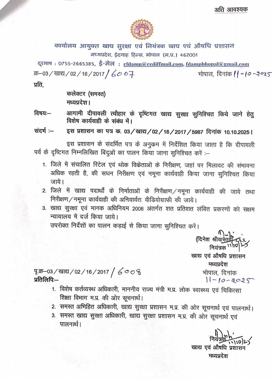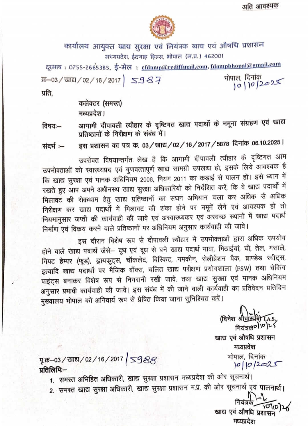 फूड कंट्रोलर ने पत्र में कहा, विशेष रूप से दूध एवं दूध से बने खाद्य पदार्थ मावा, मिठाईयां, धी, तेल, मसाले, गिफ्ट हेम्पर (फूड), ड्रायफ्रूट्स, चॉकलेट, बिस्किट, नमकीन, सेलीब्रेशन पैक, ब्राण्डेड स्वीट्स, इत्यादि खाद्य पदार्थों पर मैजिक बॉक्स, चलित खाद्य परीक्षण प्रयोगशाला (FSW) तथा चेकिंग पाइंट्स बनाकर विशेष रूप से निगरानी रखी जाये, तथा खाद्य सुरक्षा एवं मानक अधिनियम अनुसार कार्रवाई की जाये। इस संबंध में की जाने वाली कार्यवाही का प्रतिवेदन प्रतिदिन मुख्यालय भोपाल को अनिवार्य रूप से मुख्यालय को भेजा जाए ।