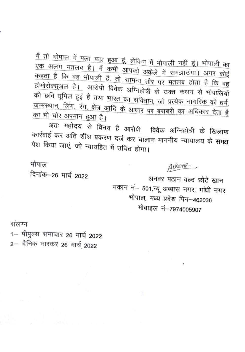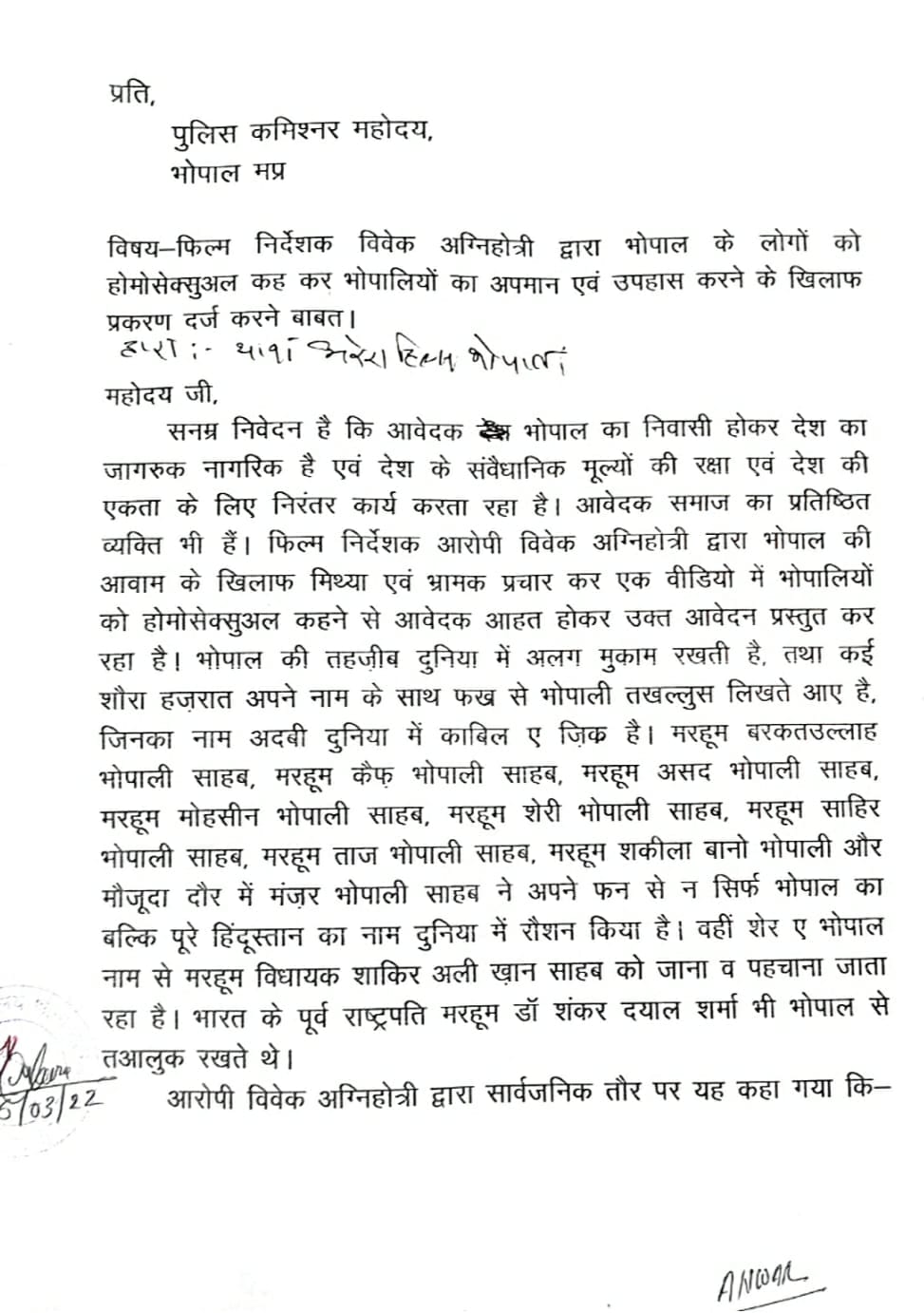 विवेक अग्निहोत्री का वीडियो सामने के बाद बवाल मच गया है। भोपाल के निवासी अनवर पठान नामक व्यक्ति ने विवेक अग्निहोत्री के बयान को भोपालियों का अपमान बताते हुए भोपाल और भोपालियों की छवि को धूमिल करने वाला कहा। उन्होंने पुलिस कमिश्नर को एक शिकायती आवेदन देकर विवेक अग्निहोत्री के खिलाफ प्रकरण दर्ज कर कार्रवाई करने की मांग की है।