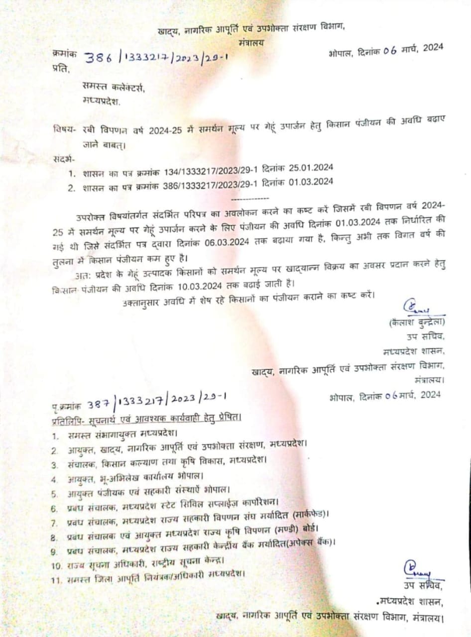 दरअसल, रबी विपणन वर्ष 2024-25 में समर्थन मूल्य पर गेहूँ की खरीदी सरकार कर रही है इसके लिए किसानों से पंजीयन केंद्रों या फिर कॉमन सर्विस सेंटर पर जाकर अपना पंजीयन कराने के लिए कहा गया है, सरकार ने पैदावार को देखते ही पंजीयन के लिए एक मार्च तक तिथि निर्धारित की थी लेकिन पंजीयन की धीमी गति को देखते हुए सरकार ने 1 मार्च को तिथि एक सप्ताह बढ़ाकर 6 मार्च कर दी, लेकिन जब कल 6 मार्च को पैदावार की तुलना में पंजीयन की गाठी धीमी देखते हुए फिर एक बार तारीख बदली और इसे बढ़ाकर 10 मार्च कर दिया है ।