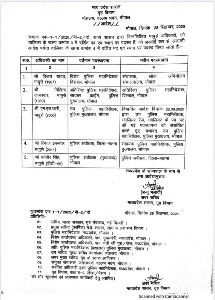 सोमवार शाम को गृह विभाग द्वारा आईपीएस अधिकारियों की तबादला सूची (IPS Transfer List) जारी की है| जिसमे पांच अधिकारियों के नाम है| विजय यादव को संचालक, लोक अभियोजन संचालनालय, भोपाल बनाया गया है| मिलिंद कानस्कर को अतिरिक्त पुलिस महानिदेशक विसबल भोपाल पदस्थ किया गया है| वहीं एमएल छारी को पुराने तबादला आदेश को संशोधित करते हुए पुनः उप पुलिस महानिरीक्षक मुख्यालय भोपाल पदस्थ किया गया है|