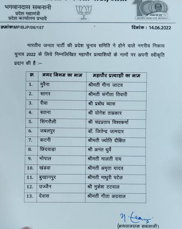 यह है जारी सूची….मुरैना से मीना जाटव, सागर से संगीता तिवारी, रीवा से प्रमोद व्यास, सतना से योगेश ताम्रकार, सिंगरौली से चंद्र प्रताप विश्वकर्मा, जबलपुर से डॉक्टर जितेंद्र जामदार , कटनी से ज्योति दीक्षित, छिंदवाड़ा से अनंत धुर्वे, भोपाल से मालती राय, खंडवा से अमृता यादव, बुरहानपुर से माधुरी पटेल, उज्जैन से मुकेश टटवाल देवास से गीता, फिलहाल 16 में से 13 महापौर प्रत्याशी घोषित वही इंदौर, रतलाम, ग्वालियर को होल्ड किया गया।