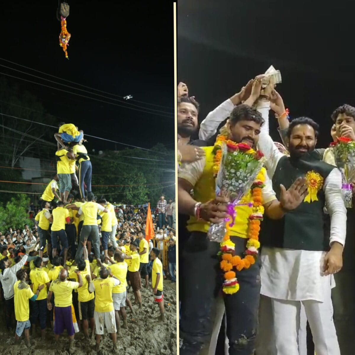 Matki Phod competition on Janmashtami in Bhopal : भोपाल में श्रीकृष्ण जन्माष्टमी के उपलक्ष्य में नेहरू नगर चौराहे पर आयोजित 18वीं मटकी फोड़ प्रतियोगिता हनुमान कुंड टीम ने जीत ली है। बुधवार देर तक तक चले मुकाबले के बाद हनुमान कुंड टीम ने जीत का सेहरा अपने सिर बांधा। विजेता टीम को कार्यक्रम के मुख्य अतिथि एवं आयोजक संस्था मातृभूमि संगठन के संरक्षक इंजीनियर संजीव सक्सेना ने 1.1 लाख रुपये की राशि व ट्रॉफी प्रदान की। सोमवारा और बापू नगर की टीमें क्रमशः दूसरे और तीसरे स्थान पर रहीं। इस प्रतियोगिता में भोपाल सहित आष्टा, बैतूल, सीहोर, हरदा आदि शहरों की टीमों ने भी हिस्सा लिया।