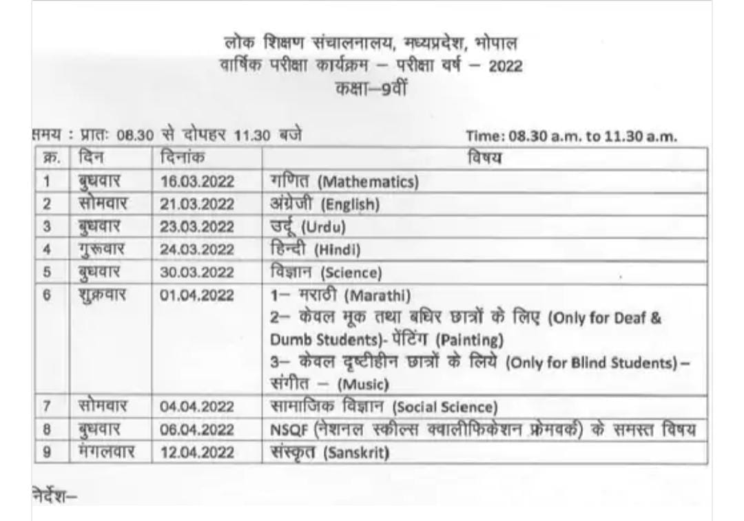 कक्षा 9 वीं का टाइम टेबल