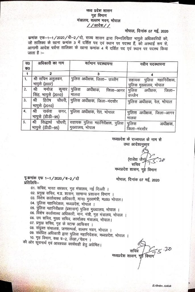 भोपाल| कोरोना संकट के बीच मध्य प्रदेश (Madhya Pradesh) में एक बार फिर बड़ी सर्जरी की गई है| पिछले दिनों कई जिलों के कलेक्टर बदले गए थे| अब आईपीएस अधिकारियों के तबादले (IPS Transfer) किये गए हैं| तीन जिलों के एसपी सहित पांच आईपीएस अफसरों के तबादले किये गए हैं| गुरूवार रात को तबादला सूची जारी की गई है|